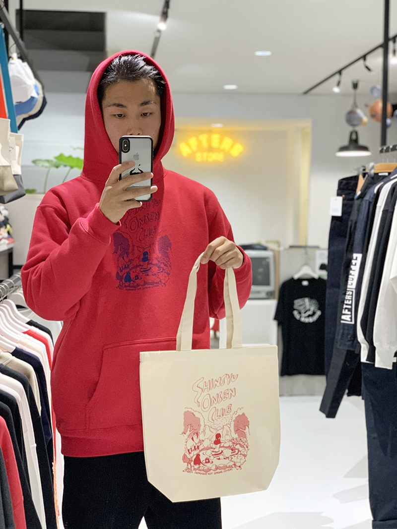 信州温泉倶楽部シリーズ。フーディーはARCH LOGO HOODIEと同じ綿ポリ裏起毛だけど毛玉のできないスウェットボディを使用。肉厚ふっくらで良い感じです。ロンTは身幅広めのビッグシルエット。トートバッグは温泉のお供にちょうど良いA4サイズがすっぽり入るサイズ(マチ付き)です。