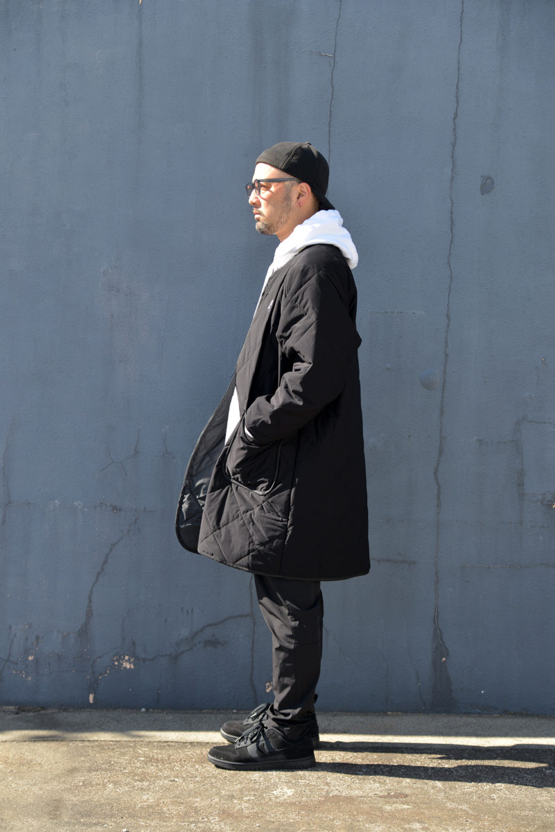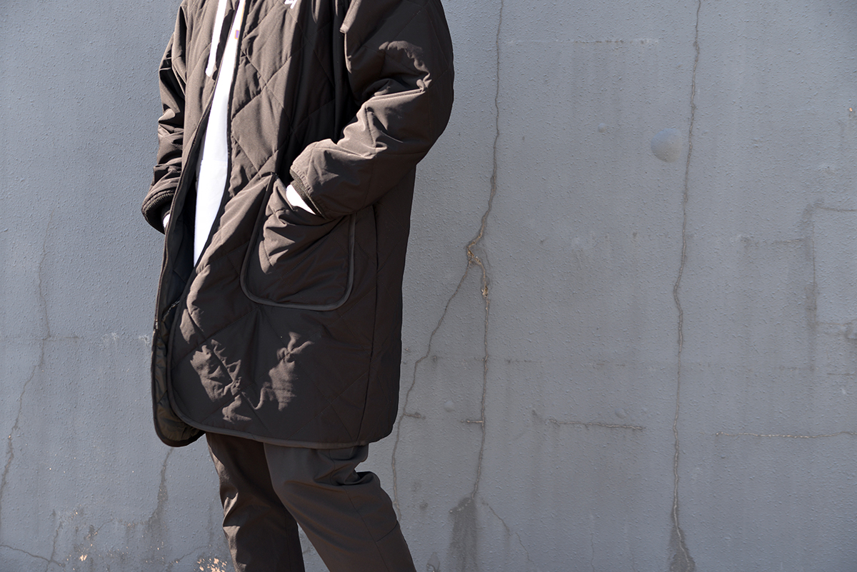 もともと軍モノのライナーだったキルティングアイテムは、昨今ではもう市民権を得てアウターとして着用する方が多いですね。このキルティングジャケットもまさにアウターとしての提案となりますが表地は好評いただいている高機能素材、ゼラノッツを使用!そして中綿にはサーモライトと、撥水、透湿性に優れながらも保温性もカバーしたという非常に満足度の高いキルティングジャケットになります。