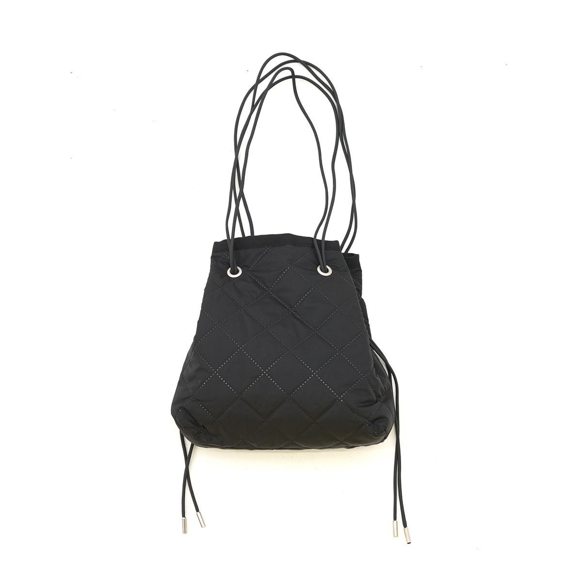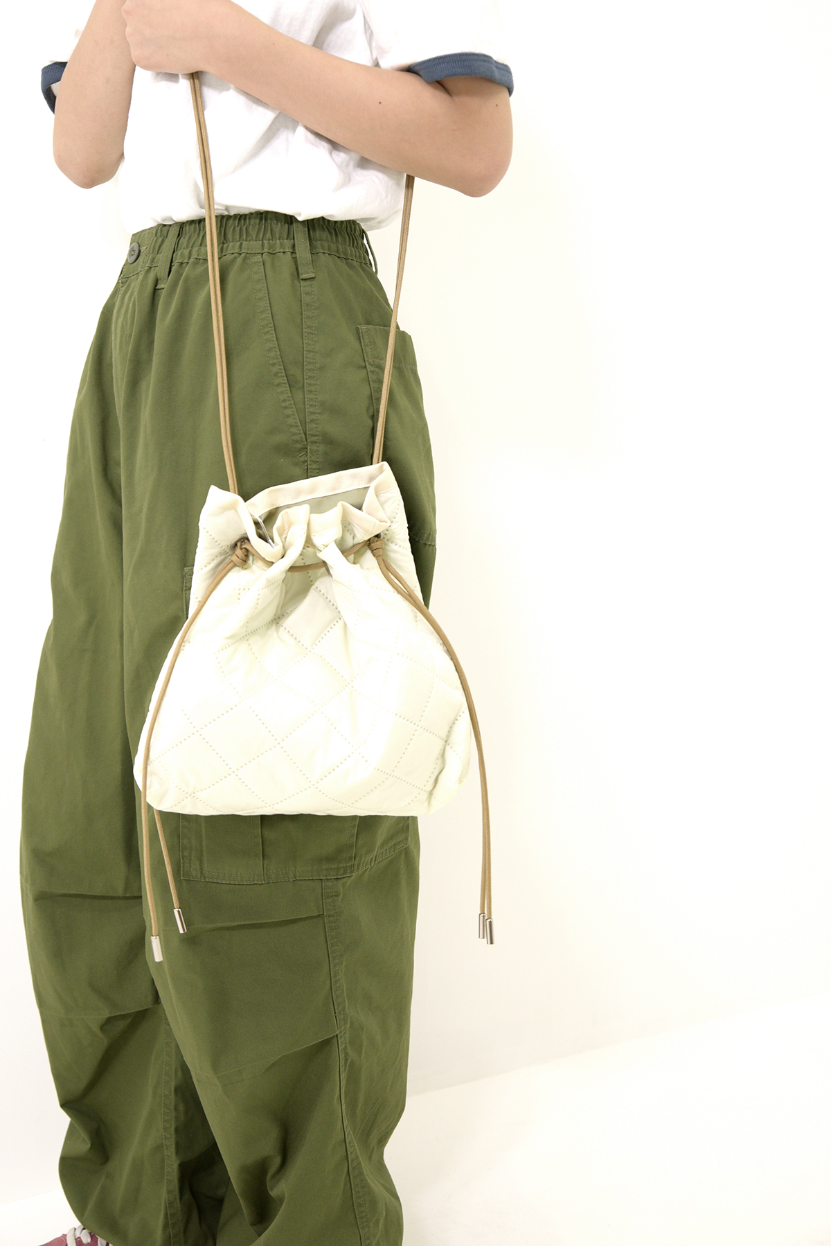 表地はピンソニックキルト加工を施した高密度ナイロンタフタ、裏地にクラシックな60/2 玉虫調ギャバを使用した、リバーシブル仕様の巾着バッグです。