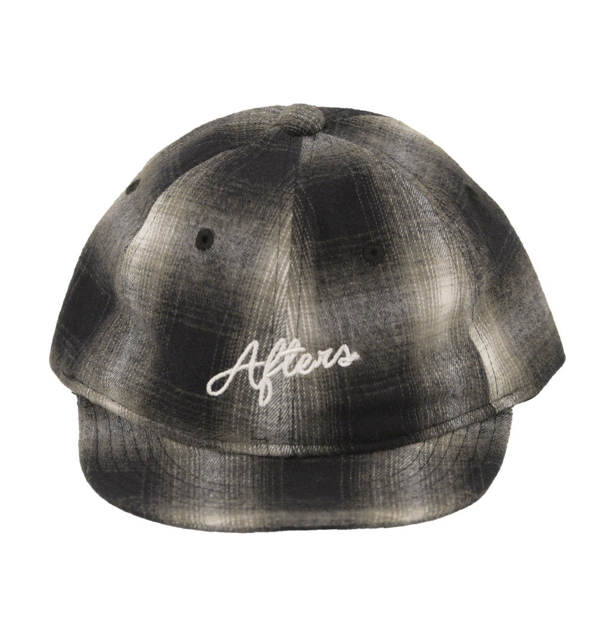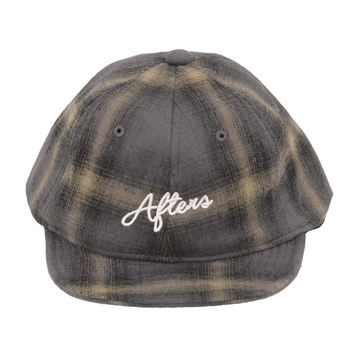 オンブレチェック生地を使用したアンパイアキャップ。ツバの先端にワイヤーが入り、お好みで動きを出すことが可能です。フロントにAFTERS®︎の筆記体刺繍。