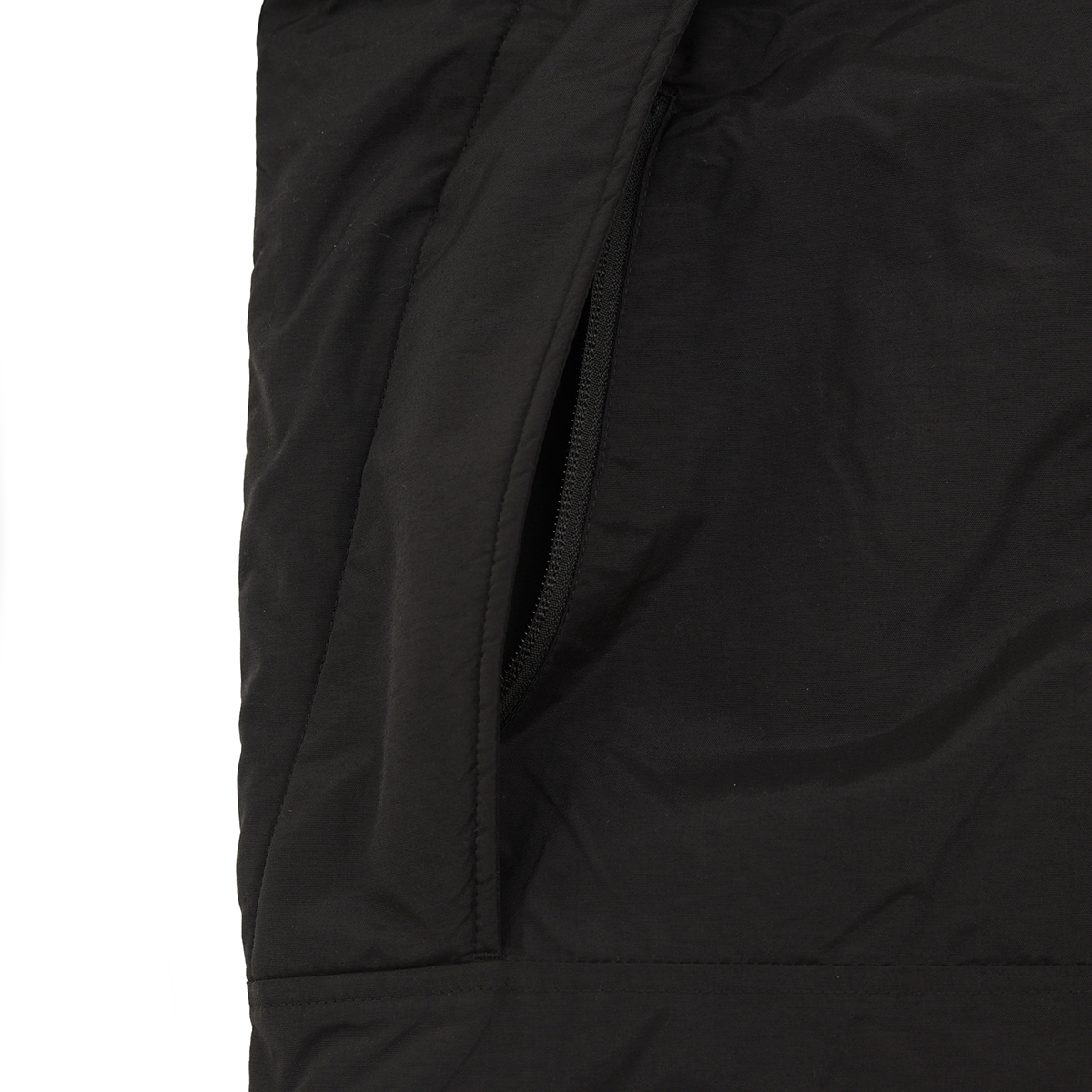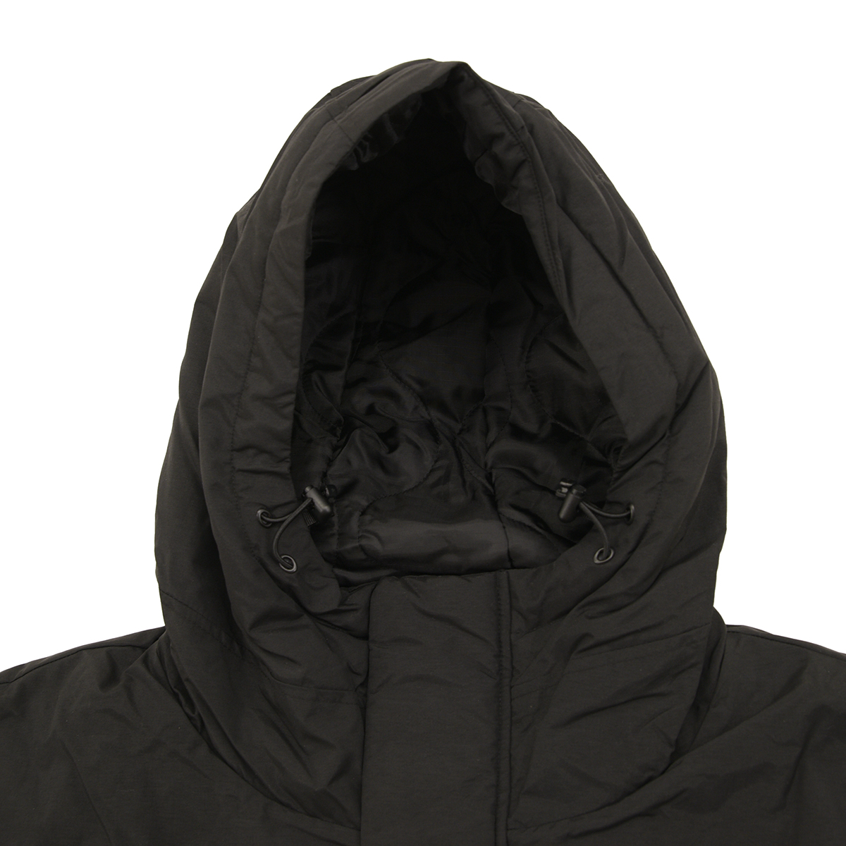 中綿入りのフードジャケット。立体感のある襟まわり、シャーリング&ベルクロテープ仕様の袖口、裾はドローコード付き。裏地キルティング使用。