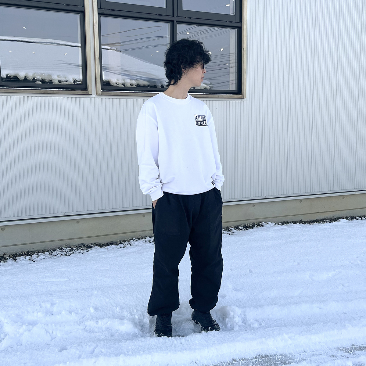 白スウェットでよく耳にするのは汚れが問題。でも皆さん白TEEは着ますよね?確かにスウェットの方が袖の分があるから汚れが付く面積が大きいですが、ぶっちゃけあまり大差ないと僕は感じます。白は漂白剤が使えるので、汚れてしまったら衣類漂白剤使えば大体の汚れは落ちます。頑固なやつはキッチンハイターでいきましょう。着用してるAC SWEATは僕の私物で、早速抹茶ラテのシミをつけてしまったので帰ったら洗濯ですね。