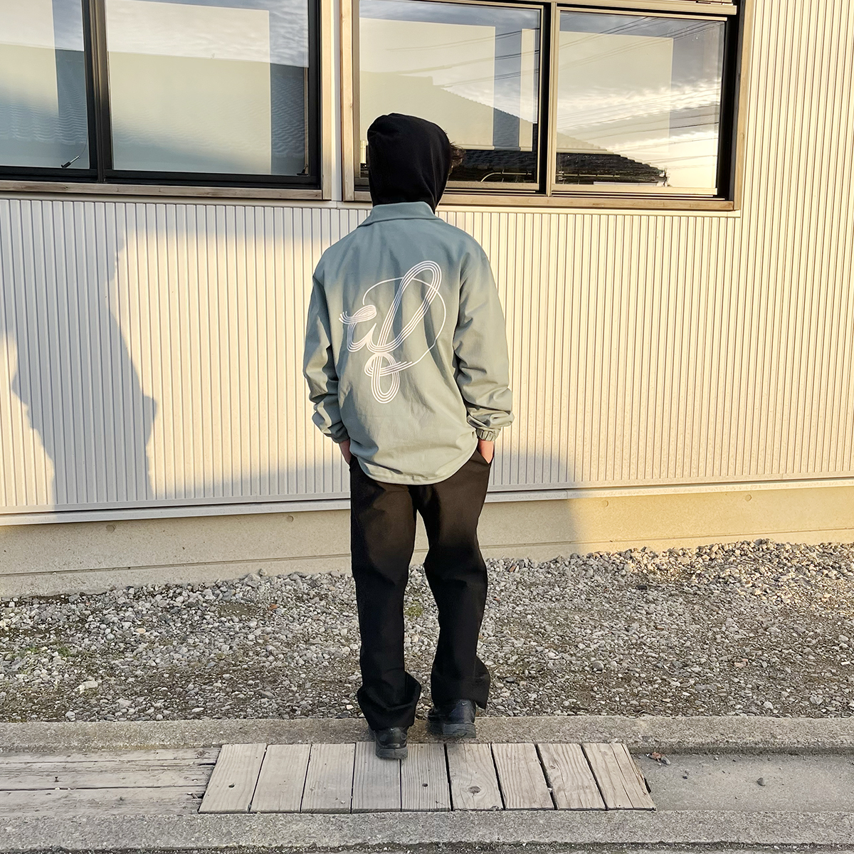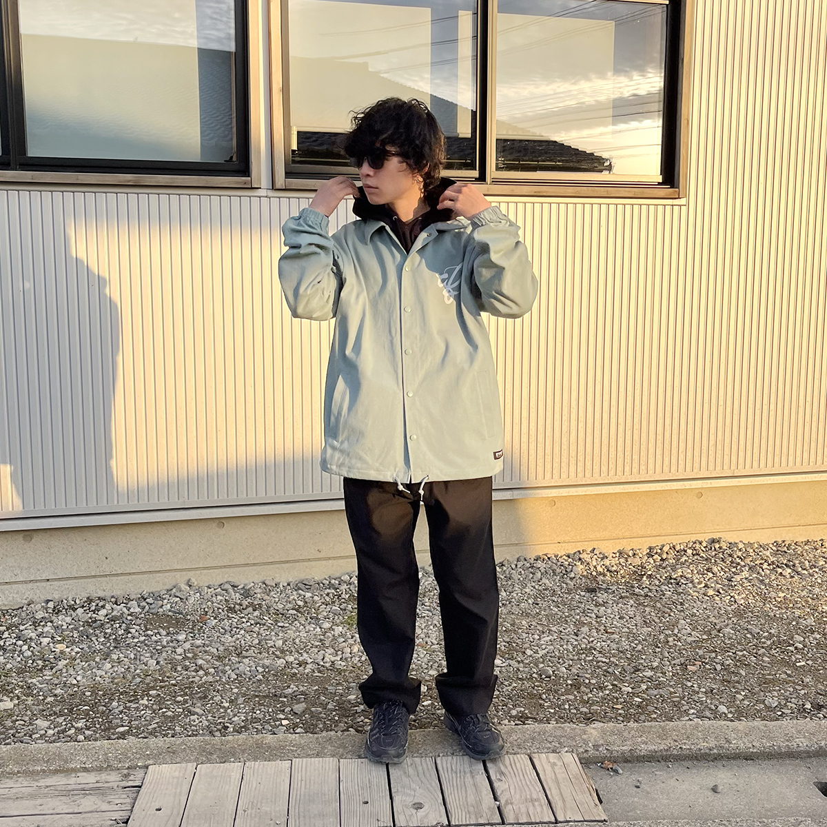 MIZUHIKI Ⅱ COACH JACKETのスタイリングです。アームホールと身幅が広めでご覧の通り、フーディーの上からでも着用可能です。コットン100%の素材なのでお手入れも非常に楽チン!汚れたら気兼ねなく洗濯出来るのもポイントです。コーチジャケット以外は黒で統一したところに、グリーンを足してあげると一気に春らしくなりますね。