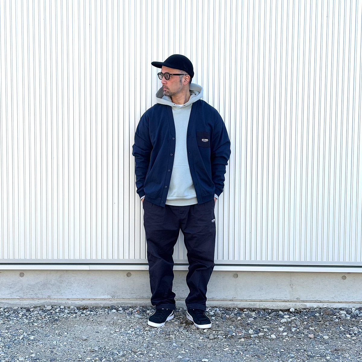 現在大変人気のカーディガン。ゆったりシルエットのパーカーにも重ね着が出来る優れもの。そしてその他は1~2年以上ヘビーローテーションで着用しているAFTERSの服ですが、やっぱりこうして新作とすんなり合わせても違和感なく楽しめるなぁと、自らも感じています。