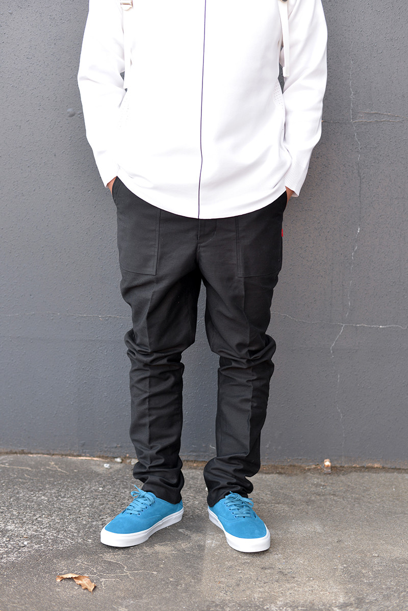 こちらのカーキはすでに完売しており、現在店頭ではBlackを販売中。パターンと縫製はもちろんe&e life design worksによるもの。元ネタはベイカーパンツやファティーグパンツと呼ばれるミリタリーパンツでストレートの太いシルエットが特徴。でも僕らの下氷鉋バージョンは太すぎず細すぎずの程よいテーパードで、一年中シーンを選ばずに穿けるシルエットに仕上げています。新品を試着していただくと十中八九「かたくて穿き心地悪いっすね〜w」となりますが、穿き込むと馴染んで最高の相棒になってくれますよ。サイズはメンズとレディースでそれぞれ2サイズずつご用意しております。ぜひ店頭でお試しください。