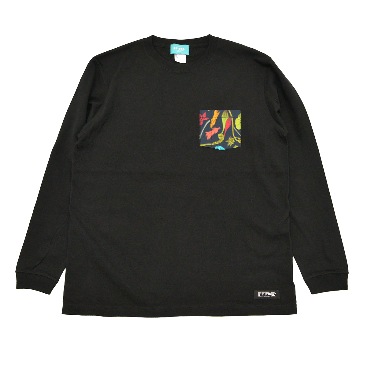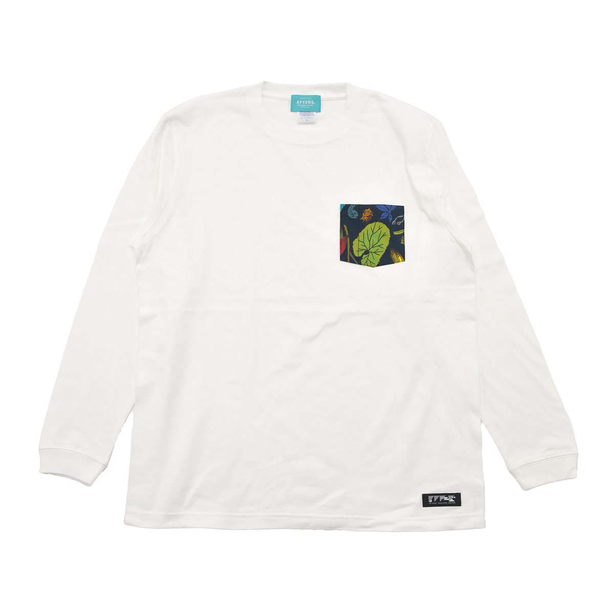 5.6オンスのコットンロングスリーブTシャツ。左胸ポケットにコットン素材のオリジナルテキスタイルを使用。ポケット柄は全てランダムになります。AFTERS®︎ AUTHENTIC SERIES同様、アイウエアがスッキリと収まる加工がなされたフロントポケットを採用。フロント裾にAFTERSネーム。