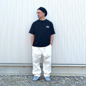 上下のHINOKIはようやく少し店頭分も出ました!こちらの写真は私の私物、結構な頻度で着込んでおり馴染んできました。インナーには新作のTシャツ。ややBOX型のいい形、GREENもありますのでお好きな色でどうぞ!