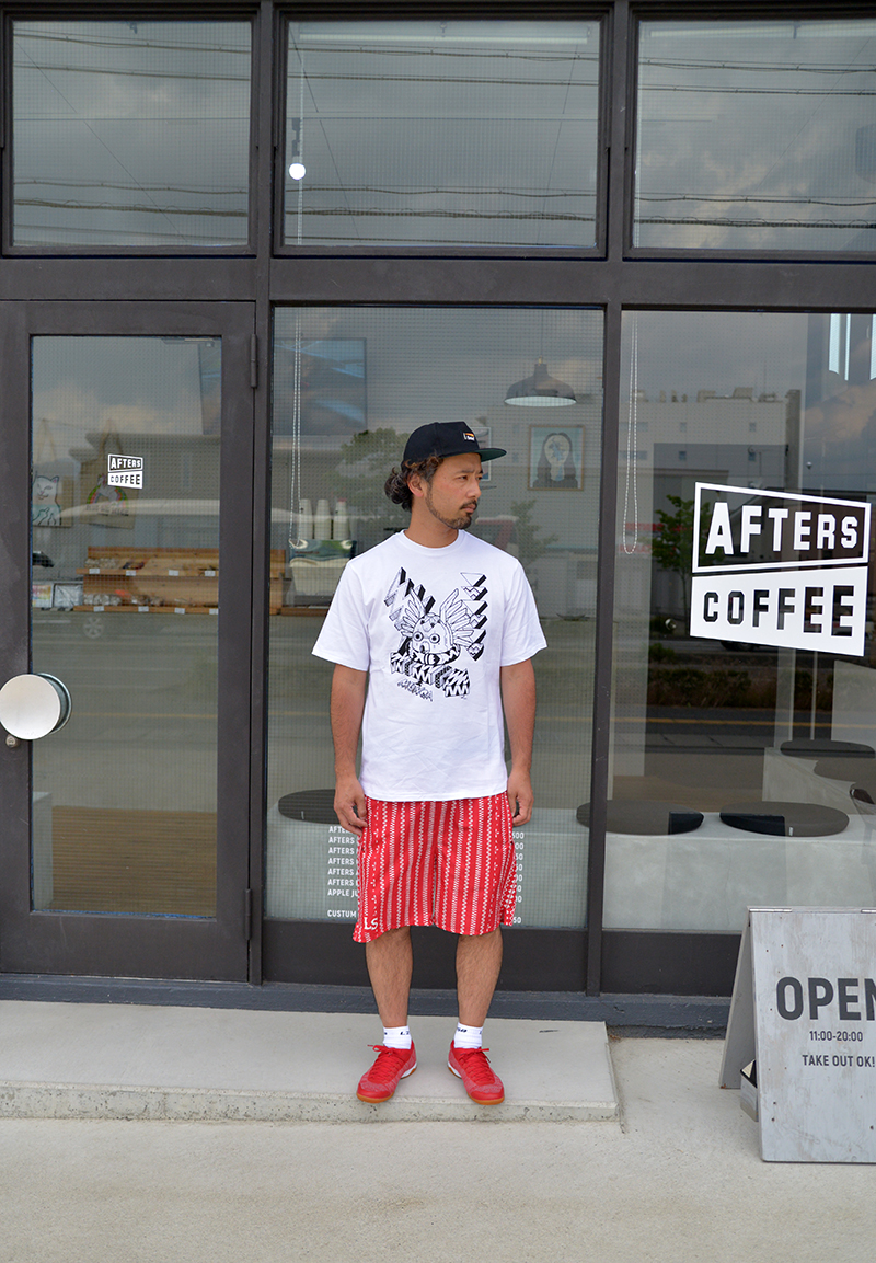 TRIBAL柄のショーツとMunqaの新作T。10年来のお客さんは「ALAKAZAM!」の時代のあの雰囲気を感じてすごくいいですね!