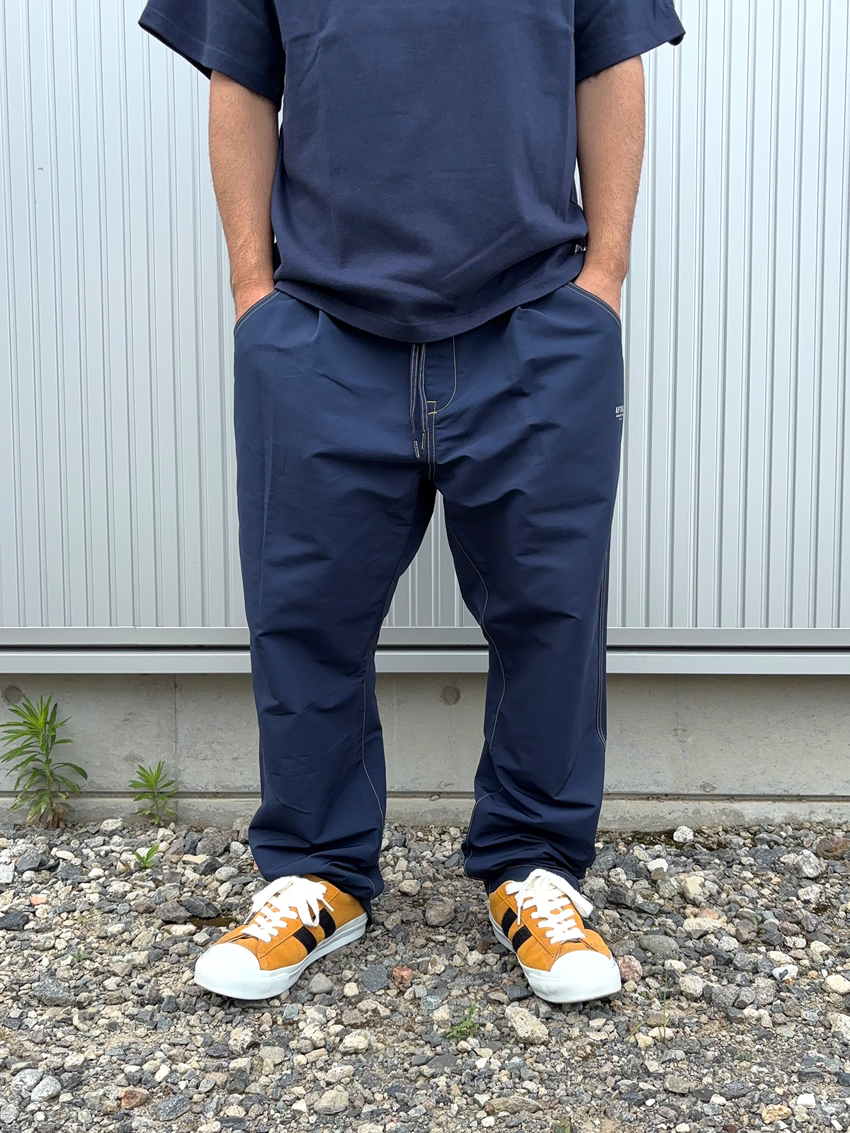 HINOKI EASY PANTS Ⅲ、AFTERS EYEAWEARのPAAKと人気アイテムを使用したシンプルなスタイルですが全身NAVYでもパンツのイエローステッチが際立って面白いともいます。