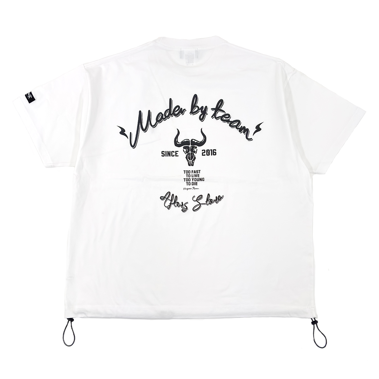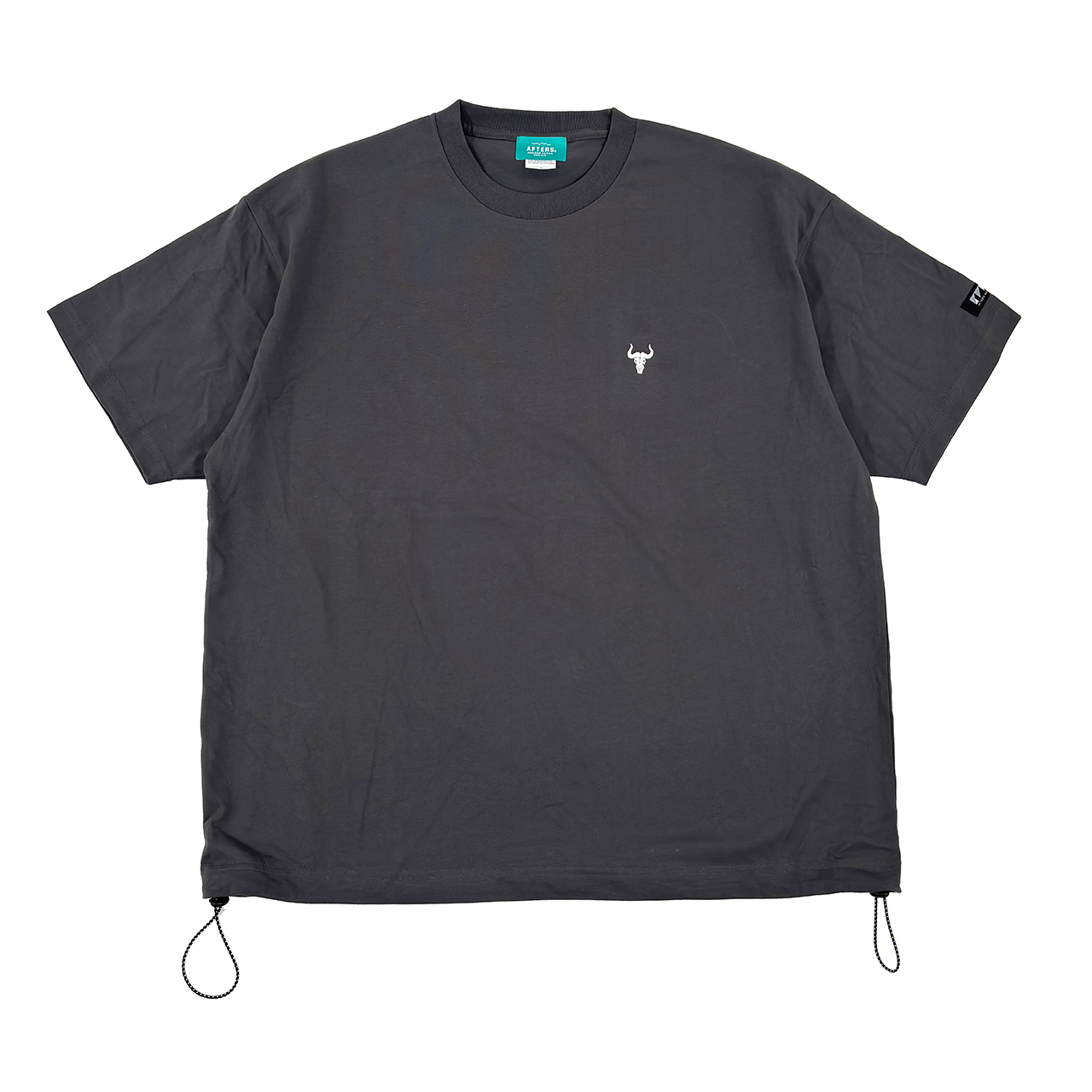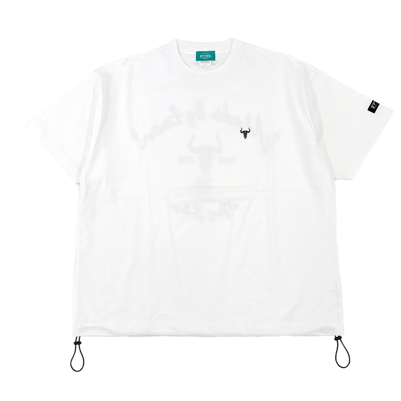 6.5オンスのコンパクトコーマ糸を使用したドローコード付きコットンTシャツ。左胸、バックにシルクスクリーンプリント。AFTERSネーム。