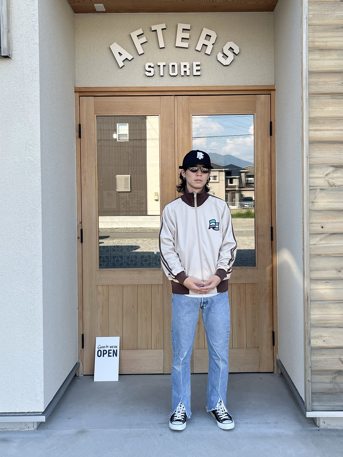 トラックジャージに合うボトムスって何だろうな〜と考え、スウェットパンツだとラフ過ぎるし、ナイロン系だとスポーティー過ぎるしと考えた結果デニムだ!となり合わせてみました。某有名なアーティストの定番の組み合わせをAFTERSで表現しました。
