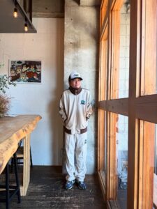 SOUVENIR LOGO ZIP HOODIEがビッグシルエットでボリュームがあるので、スッキリしたシルエットのFLAG TRACK PANTSを合わせ上手くバランスを取りました。