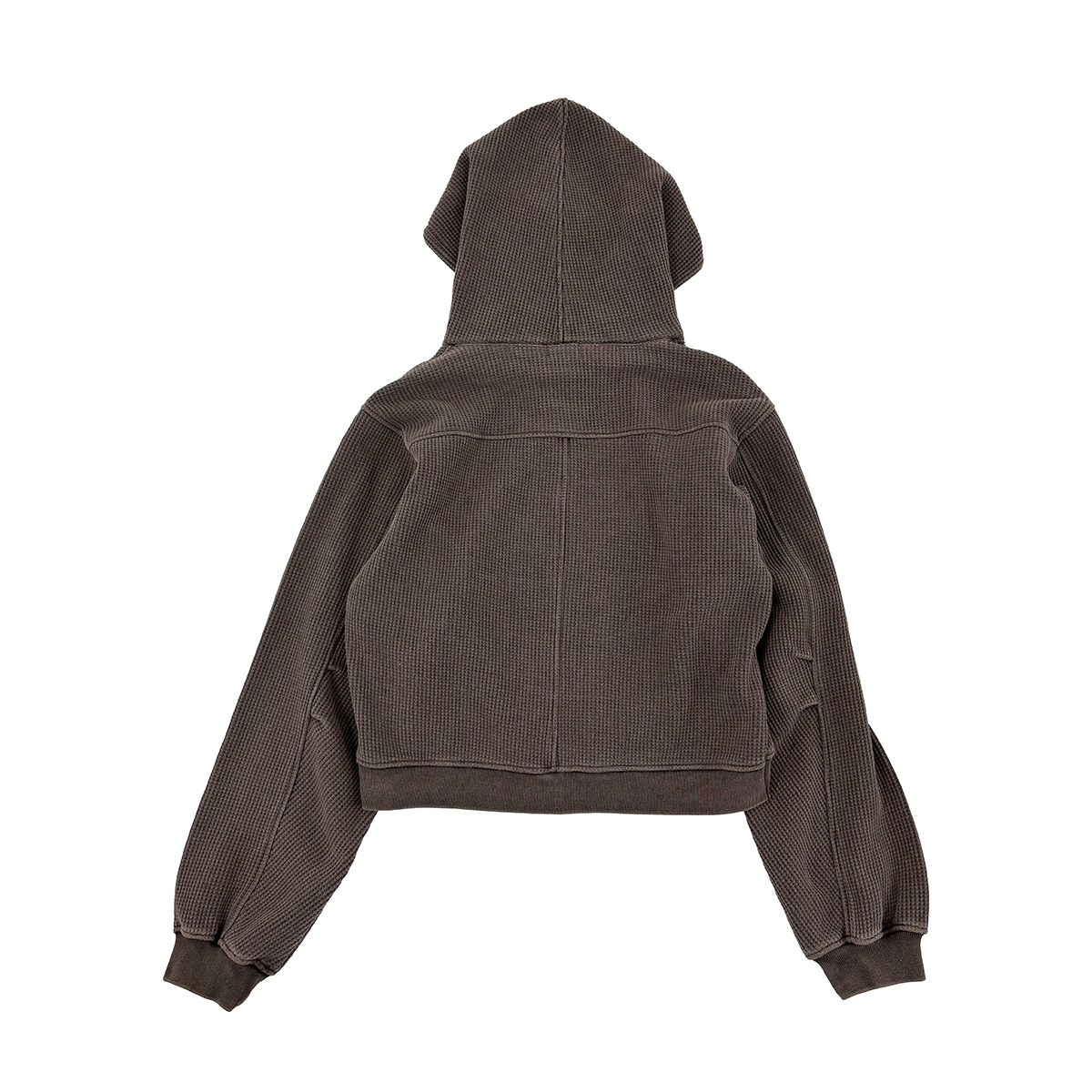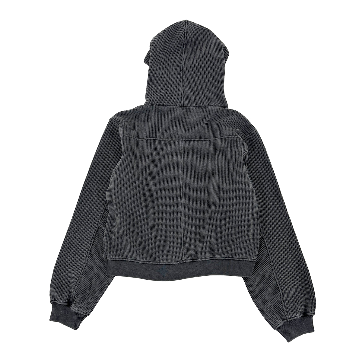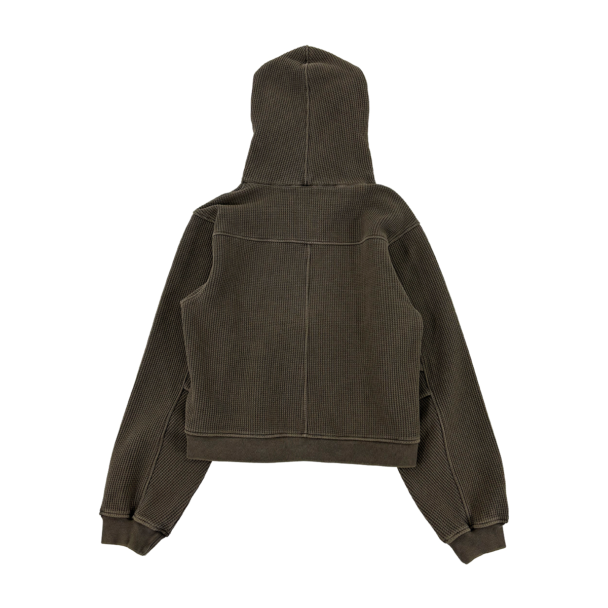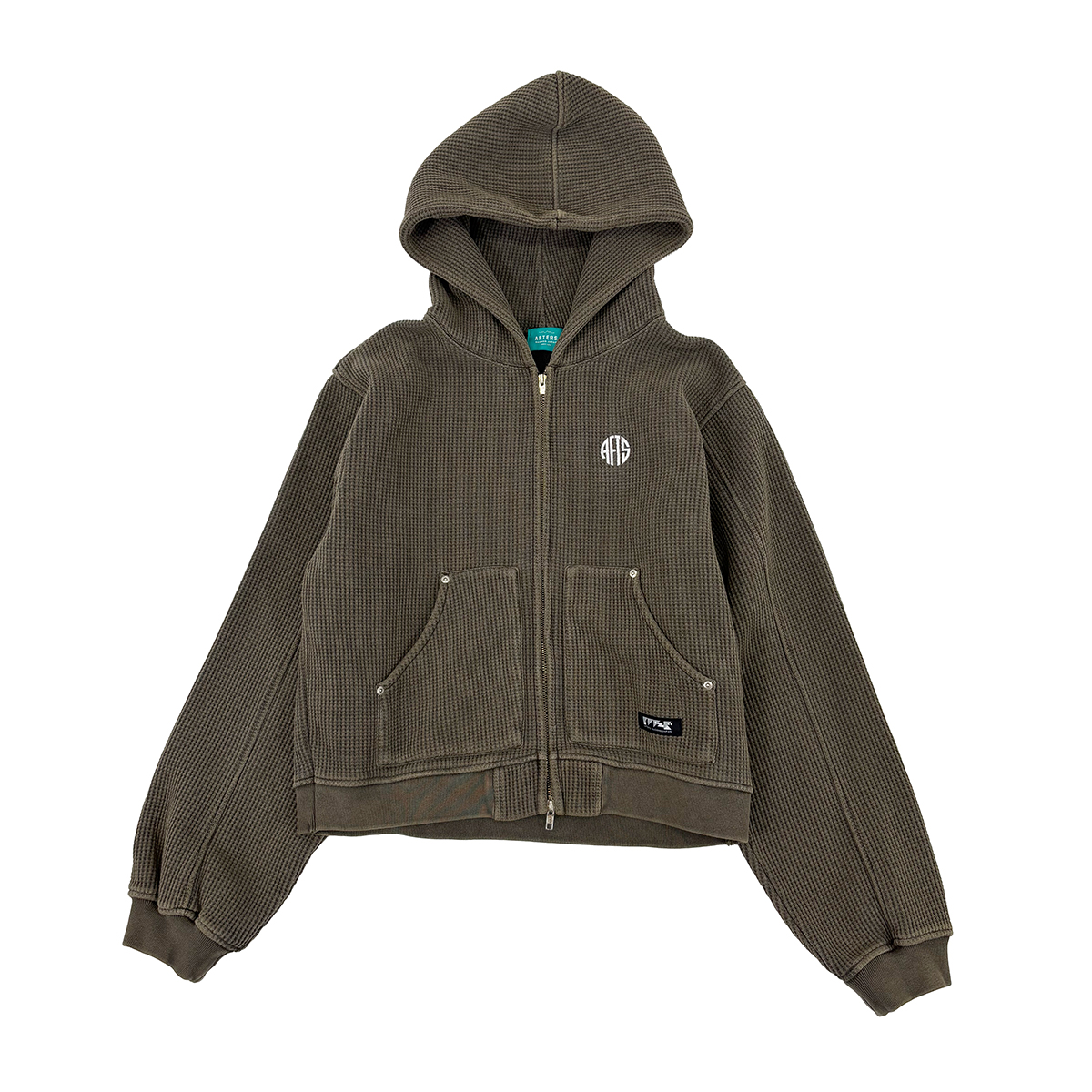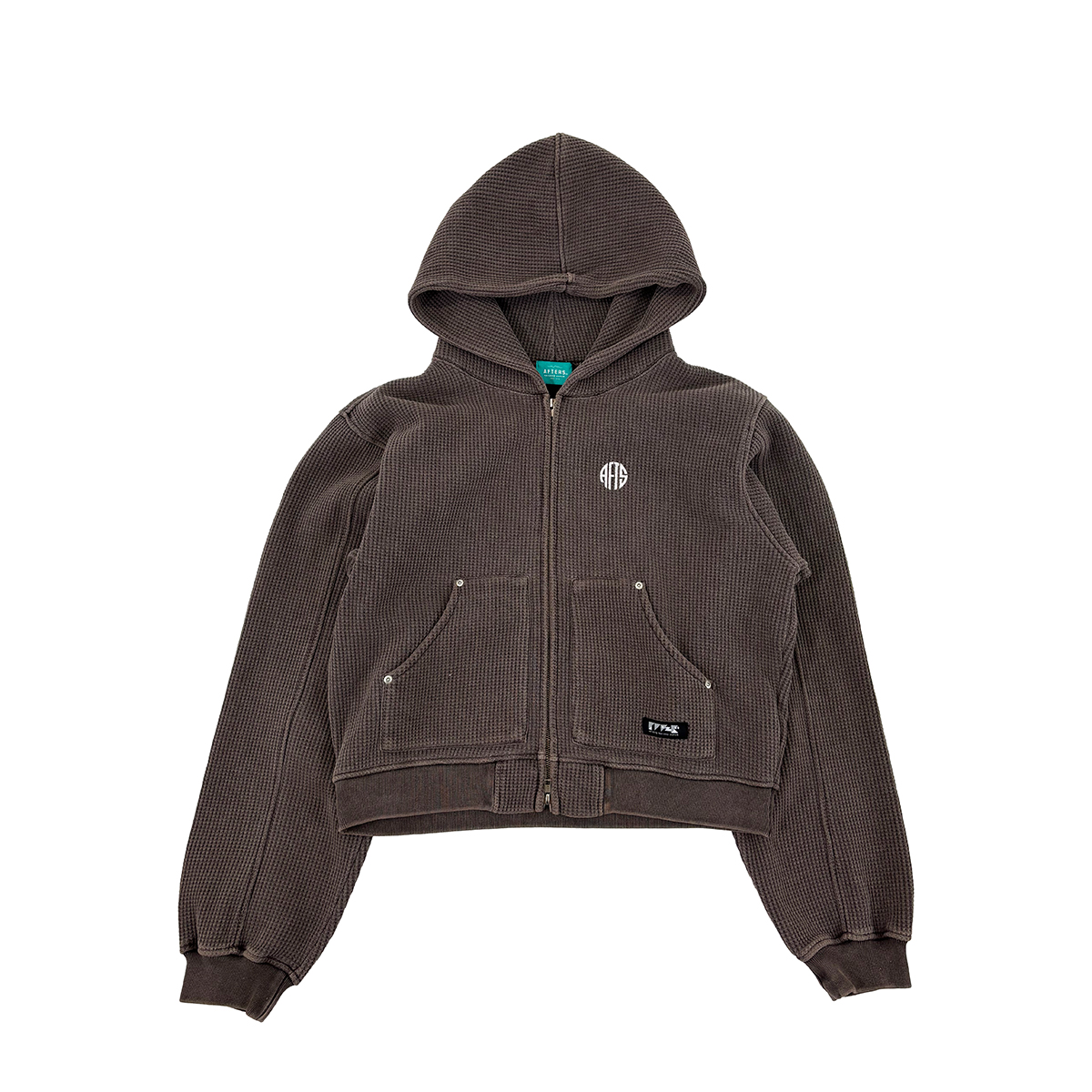 ピグメント加工を施した肉厚ワッフルジップフーディー。裏地はフリース仕様。ショート丈でハイウエストのパンツとのスタイリングもおすすめ。フロントにCIRCLE LOGO刺繍。AFTERSネーム。