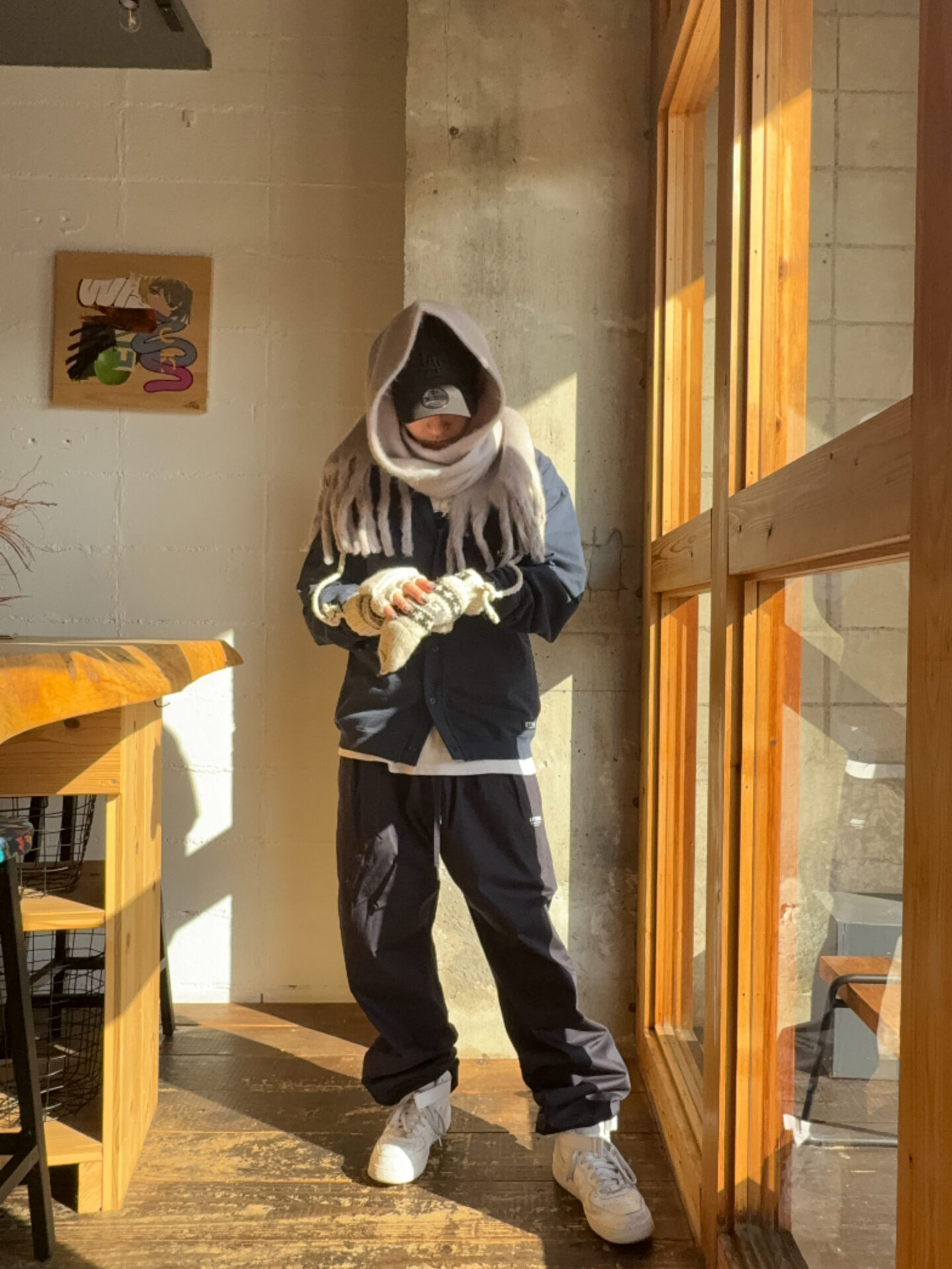 手袋は指が出せるので、スマホなど使いたい時でも取らなくていいのでとても便利です!