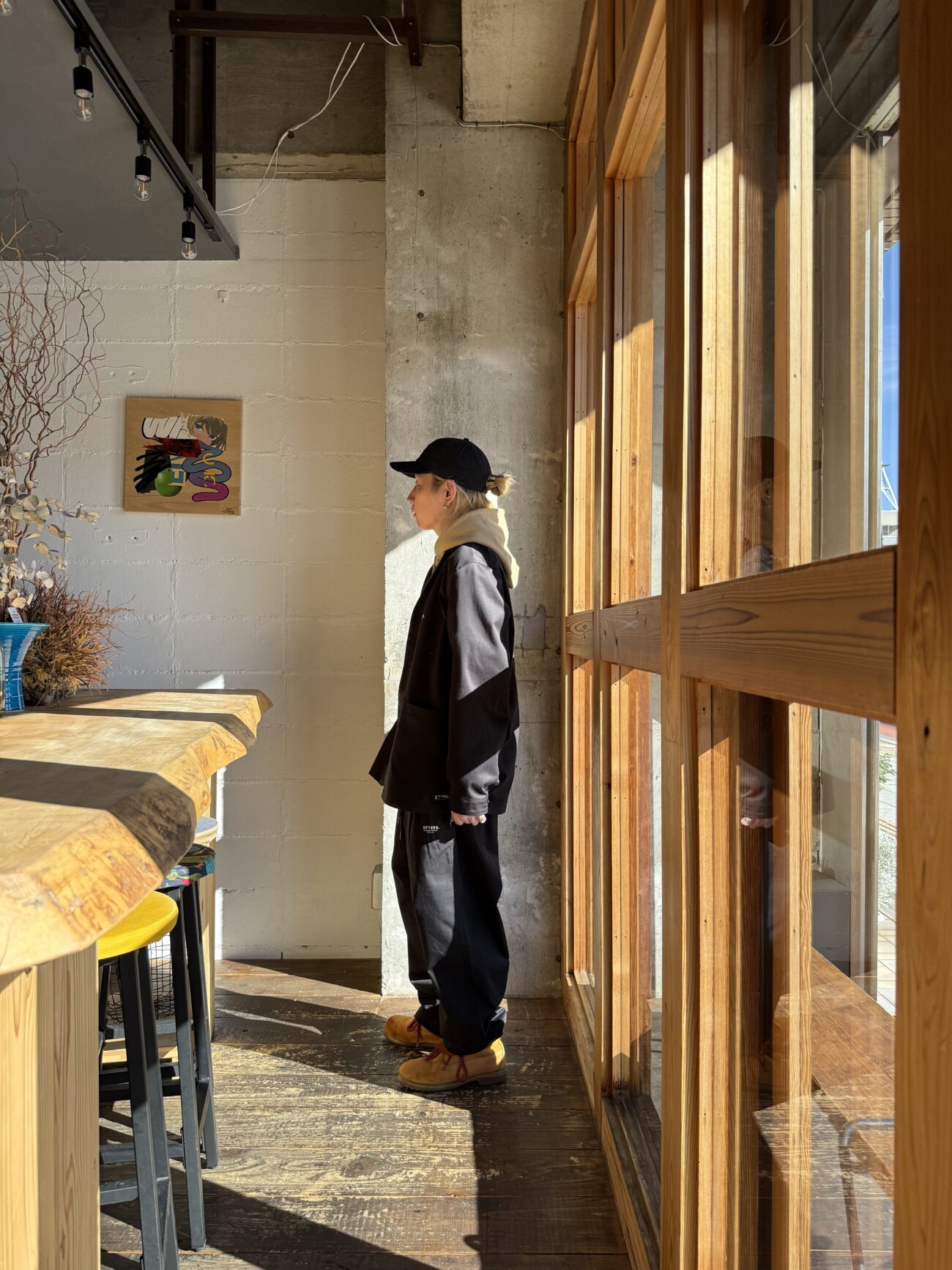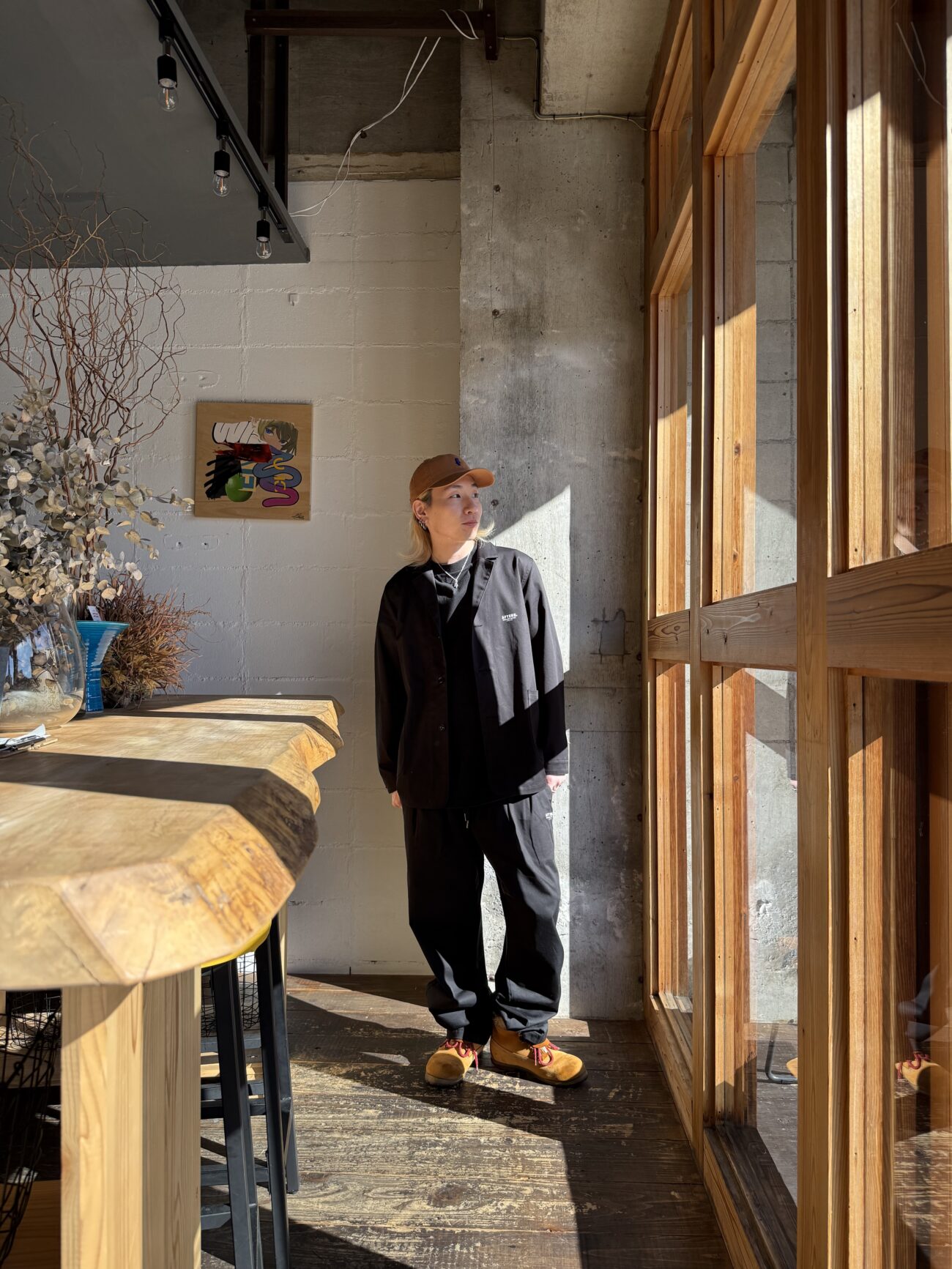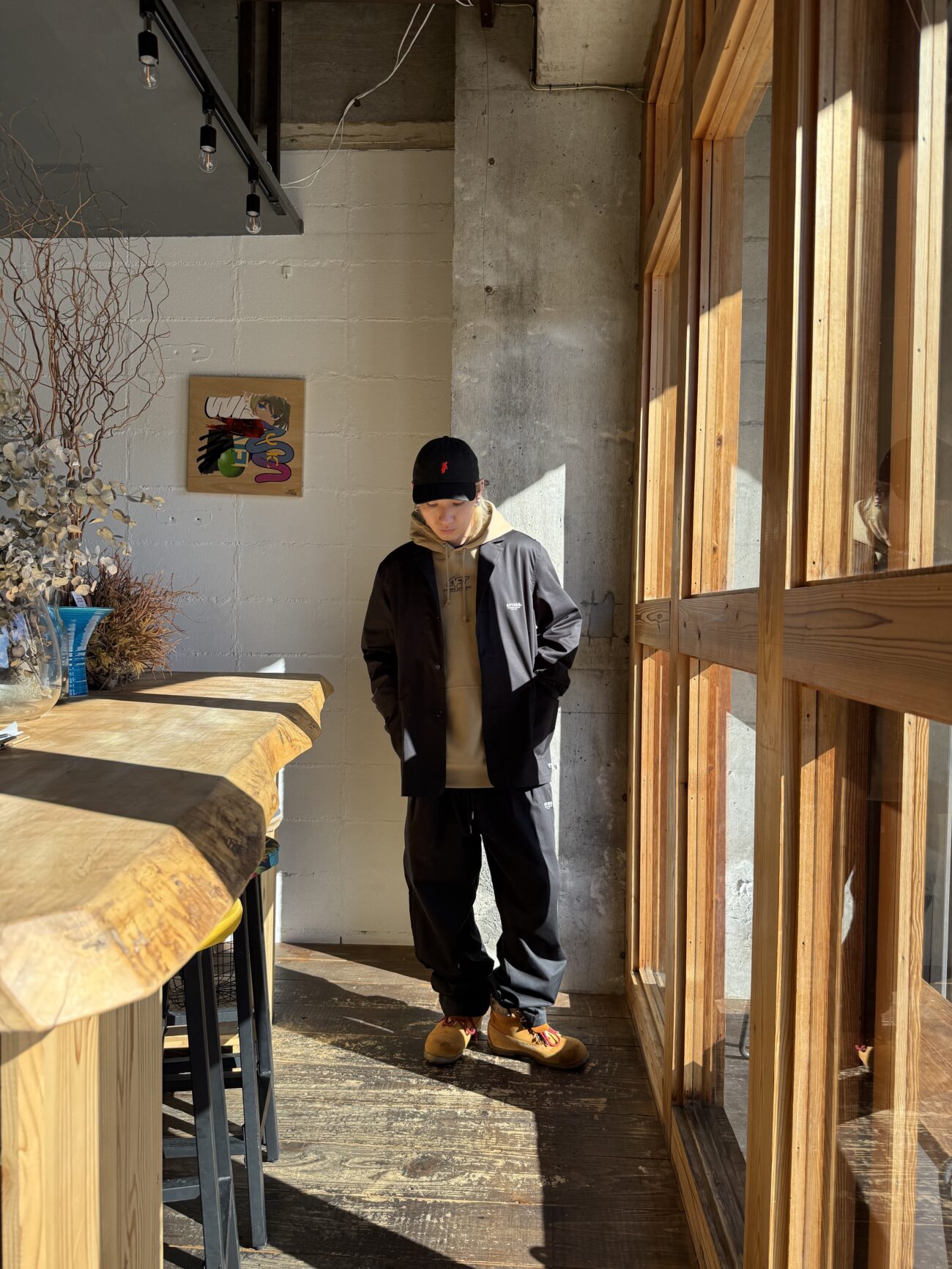 上下BLACKのHINOKI、差し色にCAMELの信州キャップと足元はティンバーです!