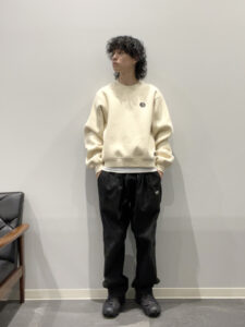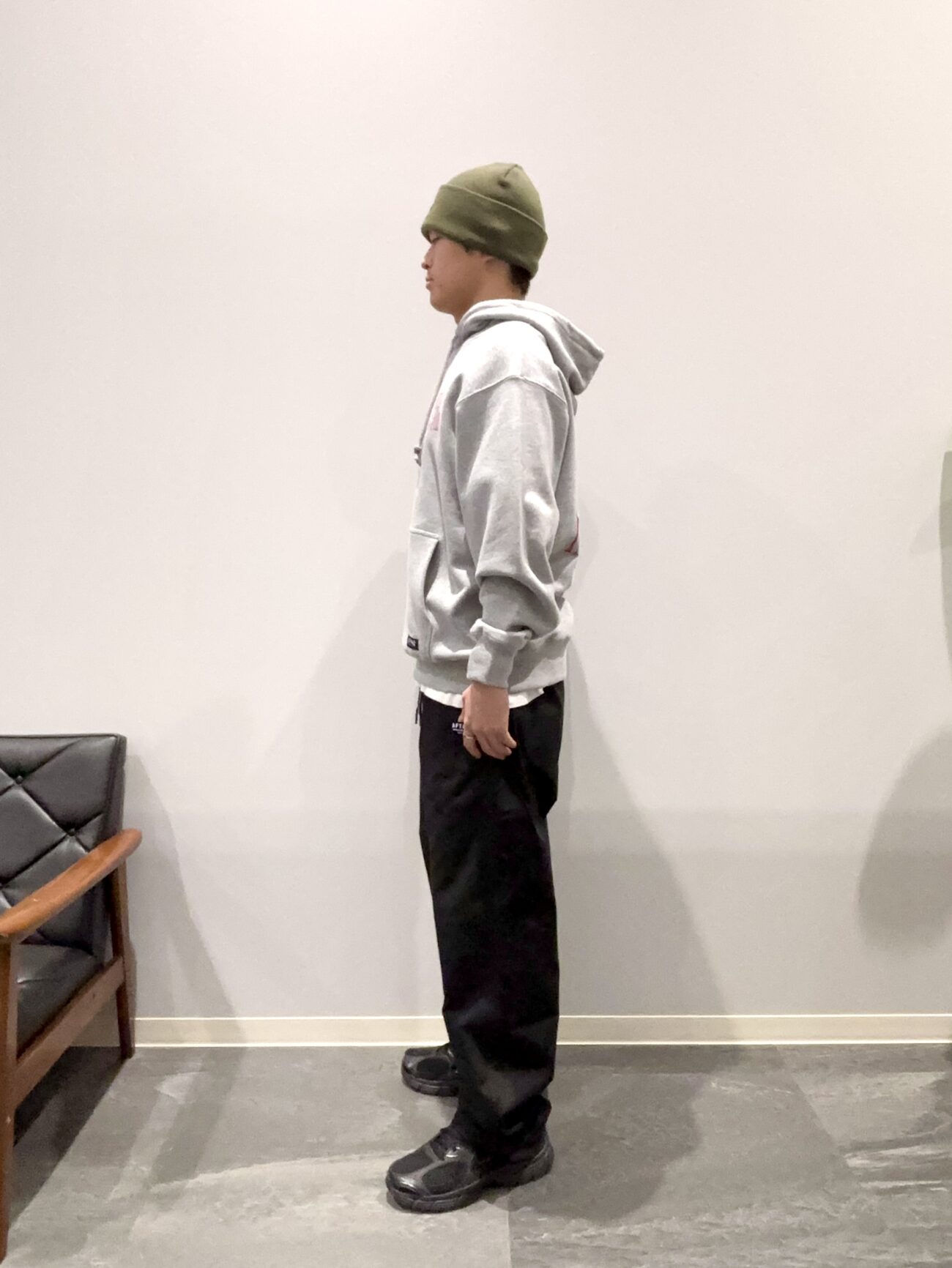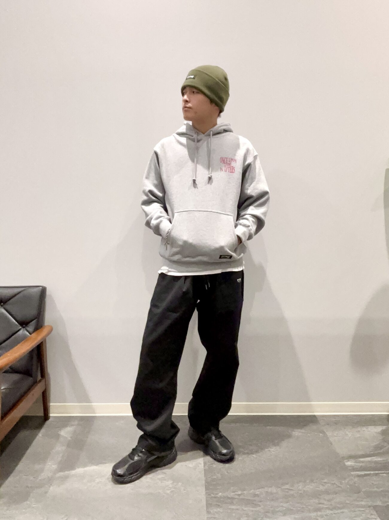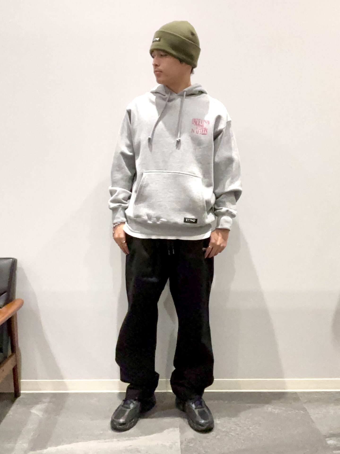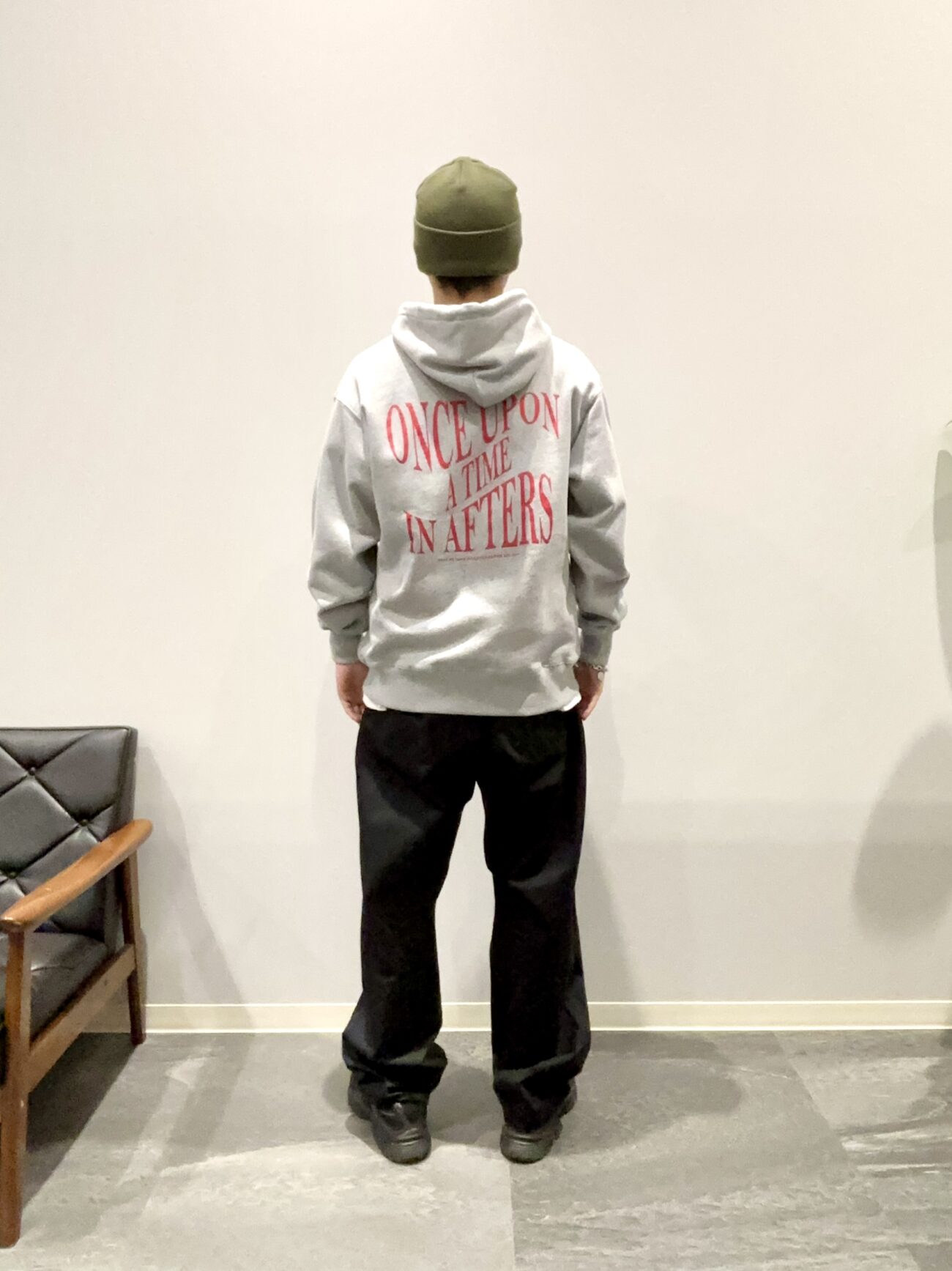 今日は、バックプリントが可愛いSTORY HOODIE と安定のHINOKI PANTS、ビーニーの色を変えてみました。
