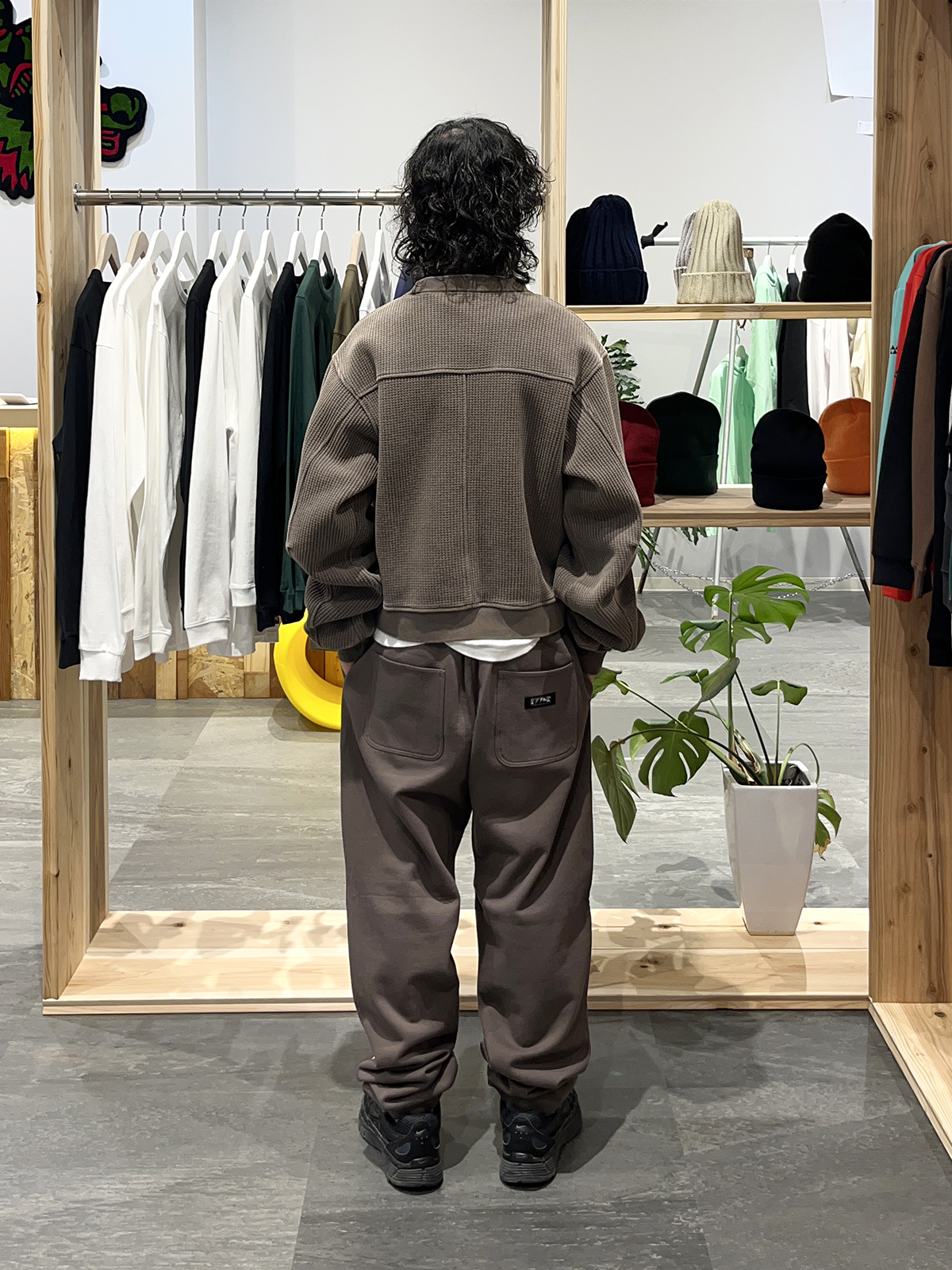 トップスがワッフル生地だったり、袖のボリューム、バックの切り返しなどデザインの表情が豊かなので、上下スウェットでもこのまま街に繰り出せますね!あとは着心地がとても楽です!!