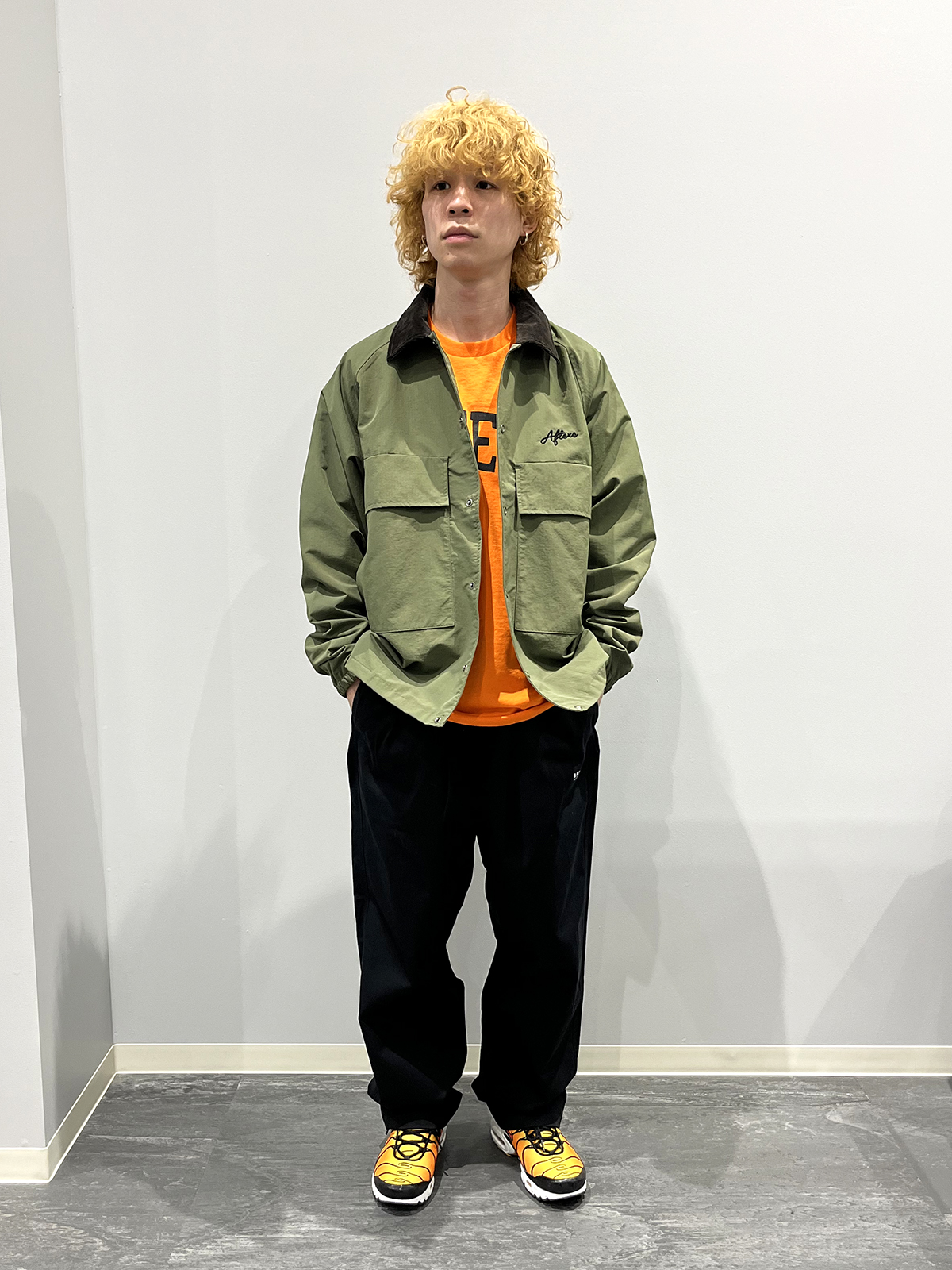 カーキにオレンジが差し色で加わった、渋すぎず、かといって幼すぎないバランスの取れた合わせになったと思います。