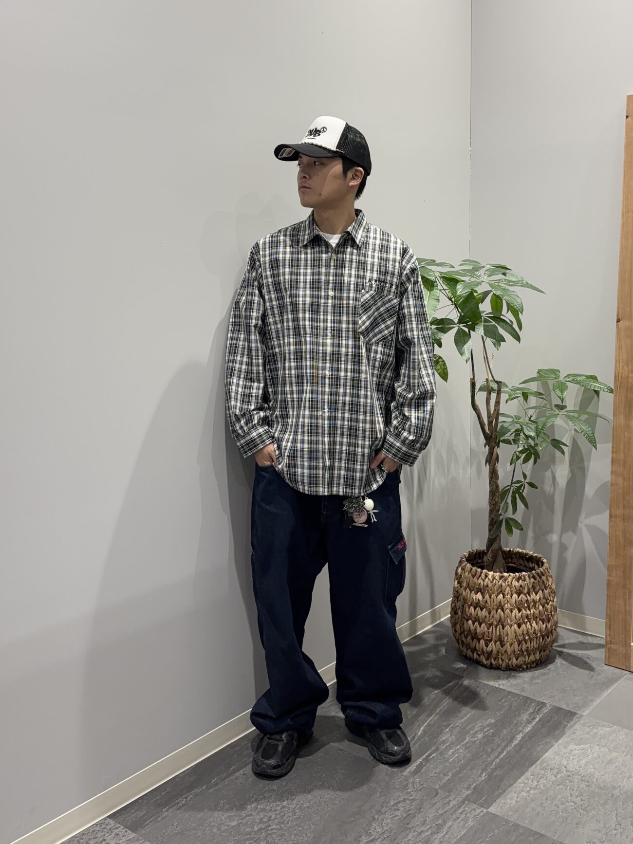 パリッとした生地のオーバーサイズめのシャツと太めのジーンズで90年代のストリートファッションをイメージしてみました。