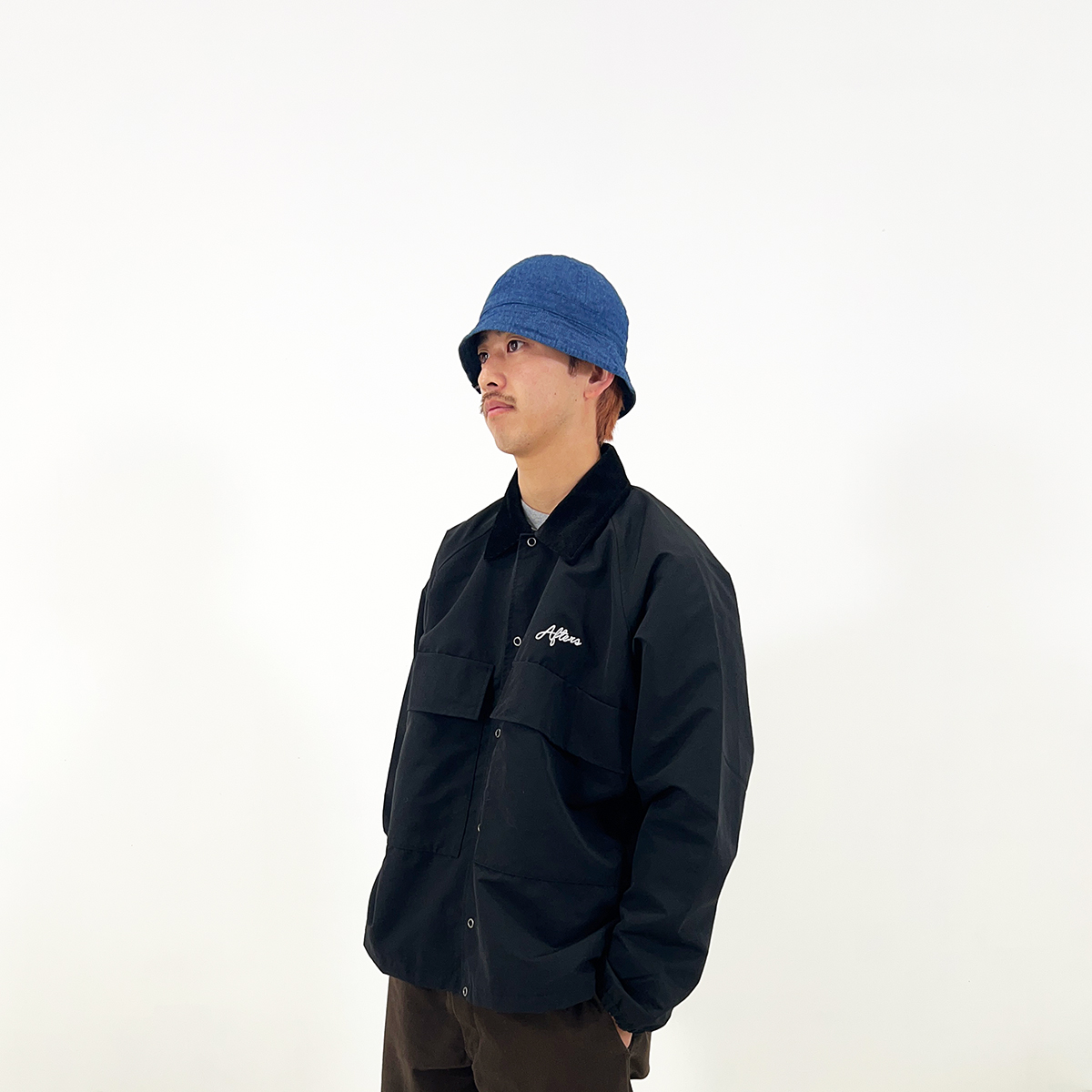 8ozのデニム素材を使用したオリジナルパターンのセーラーハット。鍔にAFTERSネーム。