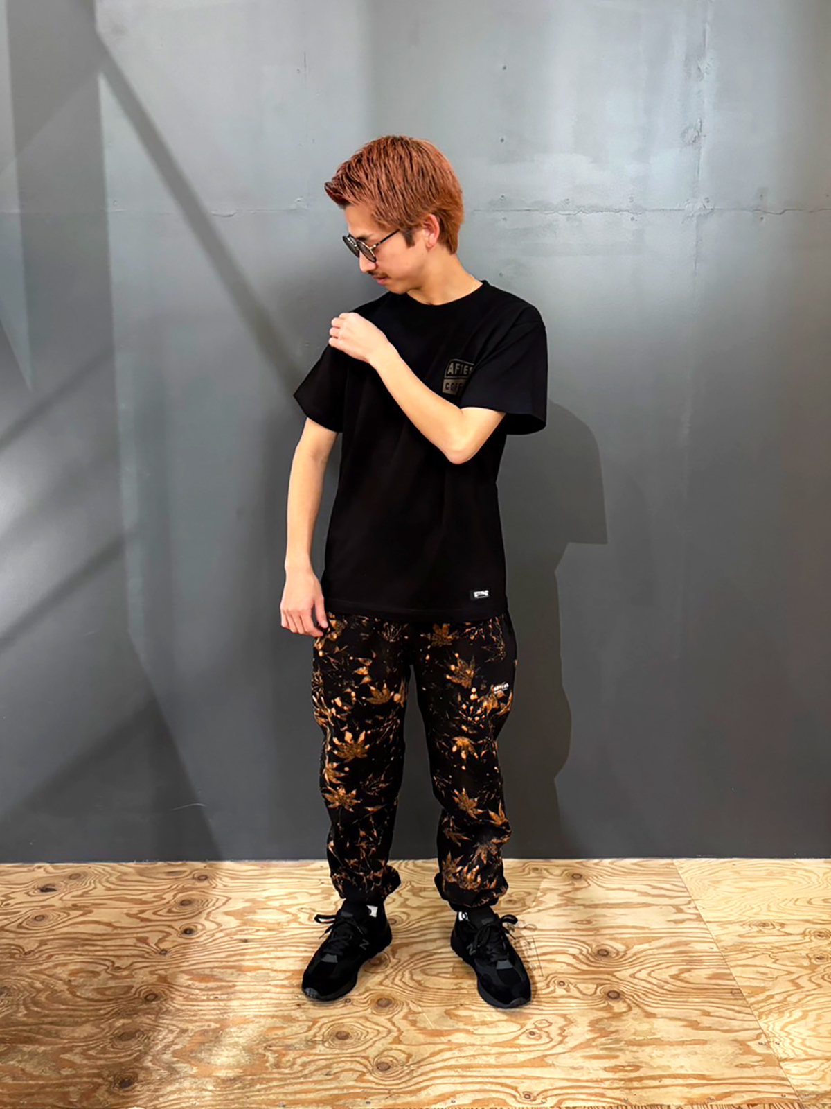 オールブラックに総柄パンツをアクセントに持ってきたスタイリング。