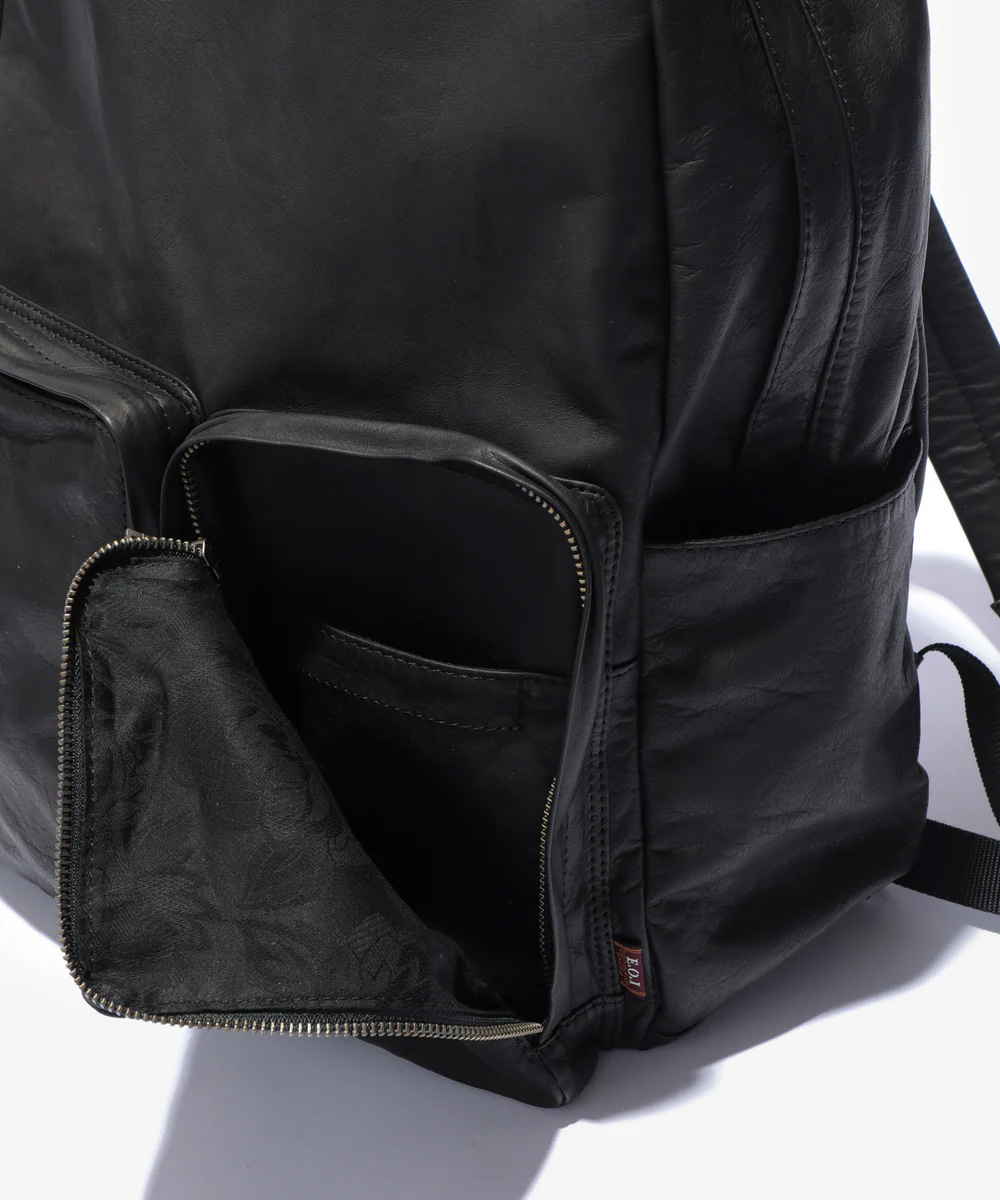 マチ付きポケットが2つ表に搭載されたデイパック。やや大きめにコントロールされたサイズ感。革の落ち感でモダンな印象に仕上がっている。内側にはタブレットが入るポケット搭載。裏地はオリジナルフラワー柄ジャガード。