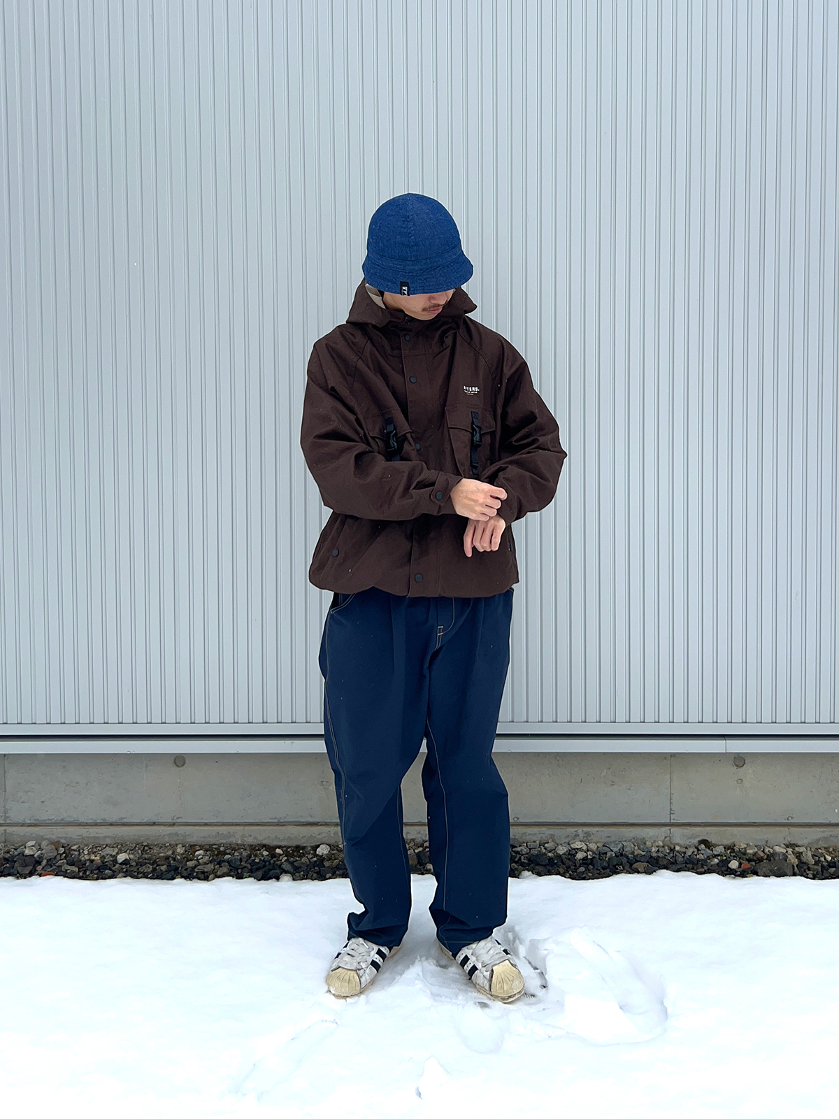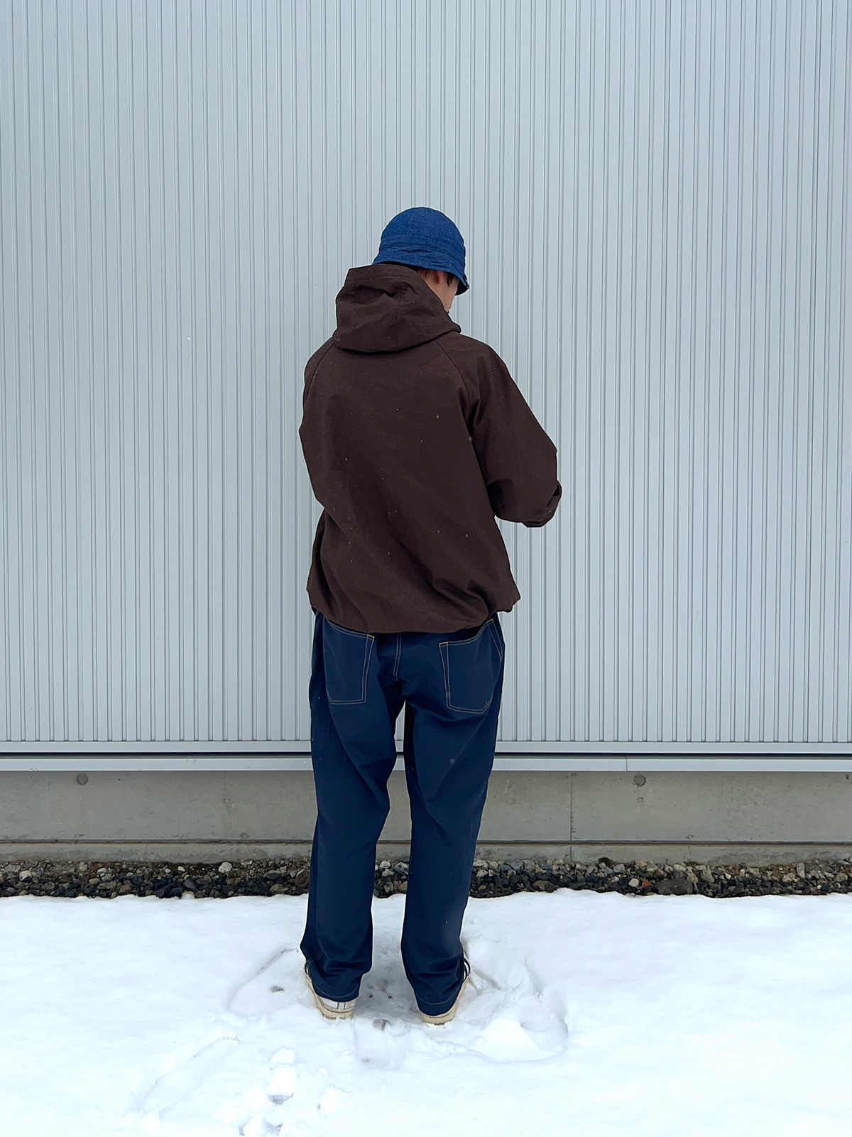 パンツは64クロスで撥水性があり、SATOYAMAは防水、防風なのでこのまま雪山やハイキングにも行けるくらいストレスなく着込めるものとなっています。