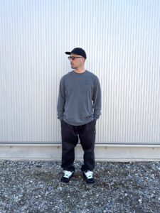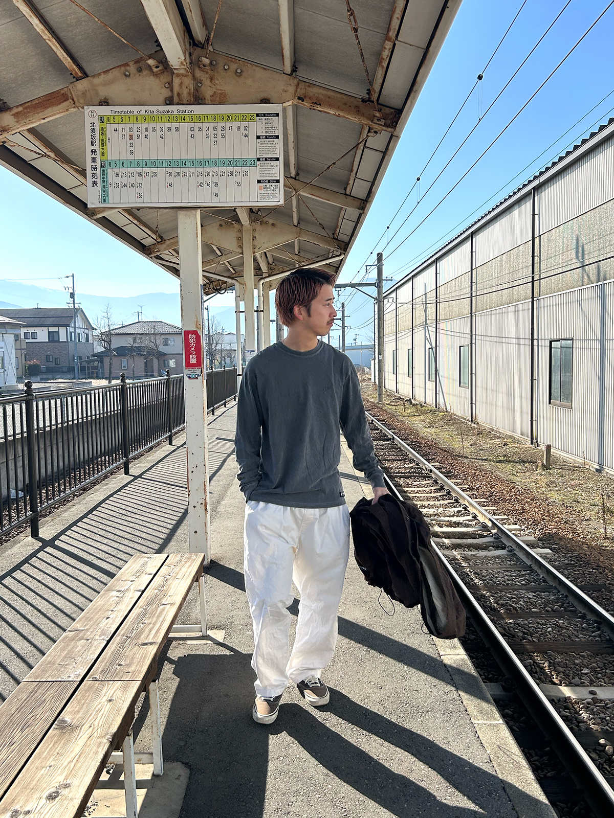 まさかここで撮影するとは思ってもいませんでしたが、今朝天気も良くロンT日和だったので1st L/S TEEと共に撮影しました!