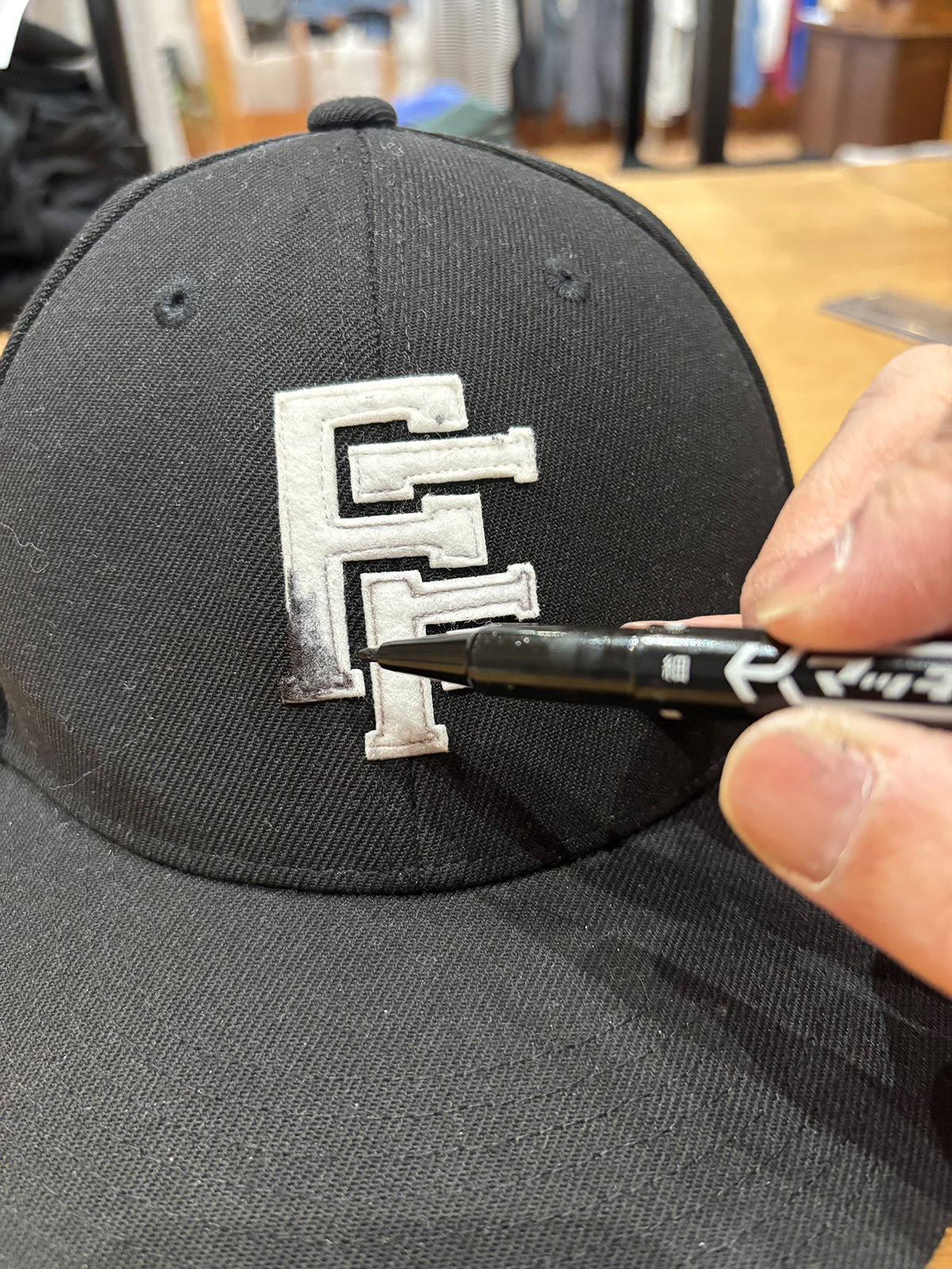 お気に入りのAFTERS®︎のCAPのフェルトがくたびれてきたので、朝作業しながら油性ペンの王様、マッキーでカスタム。
