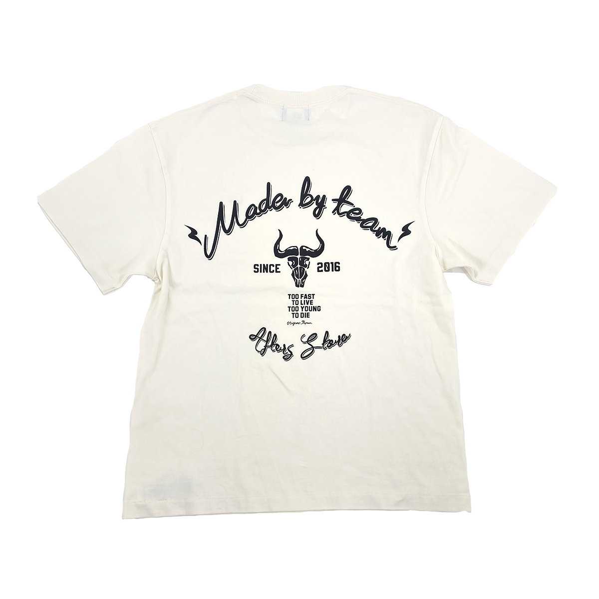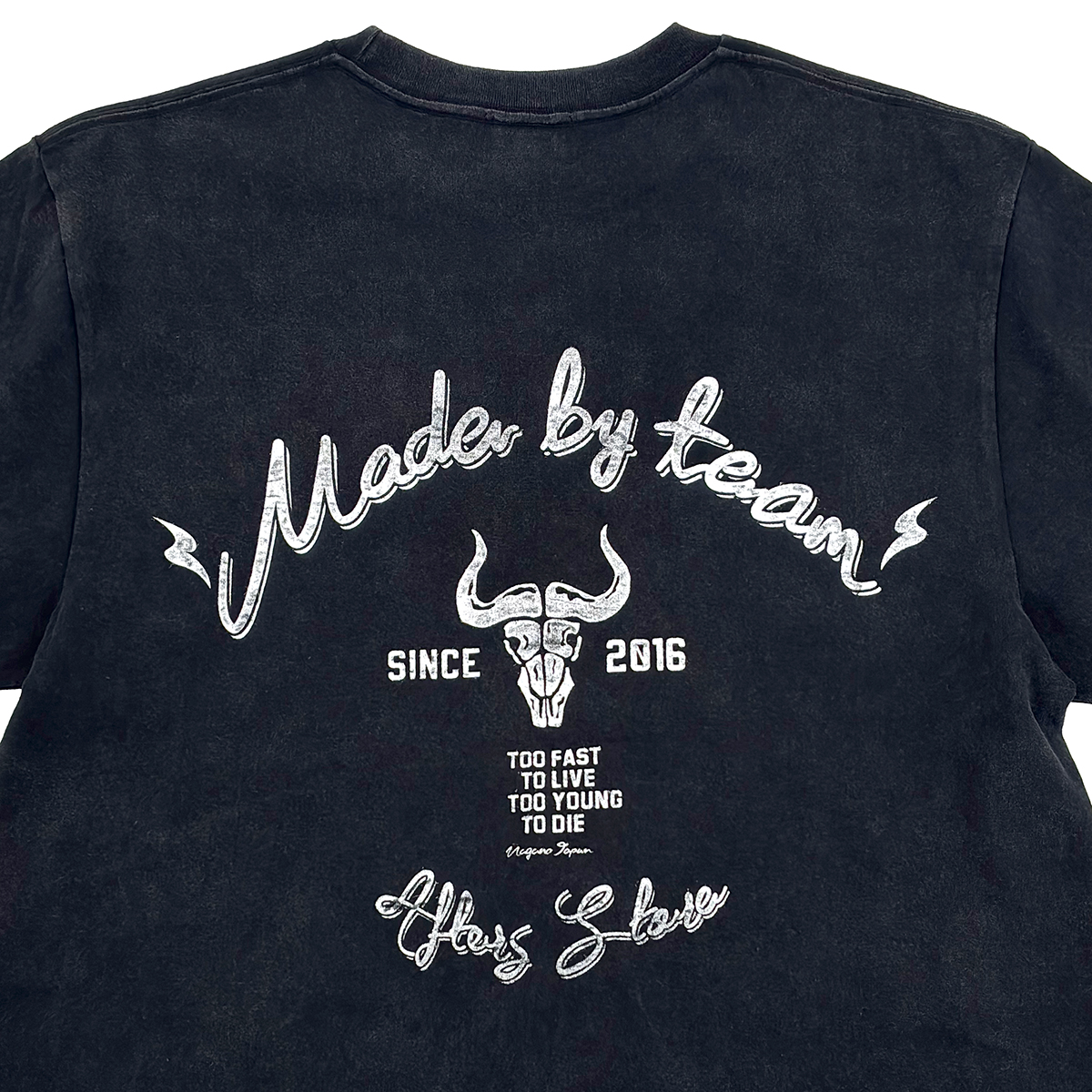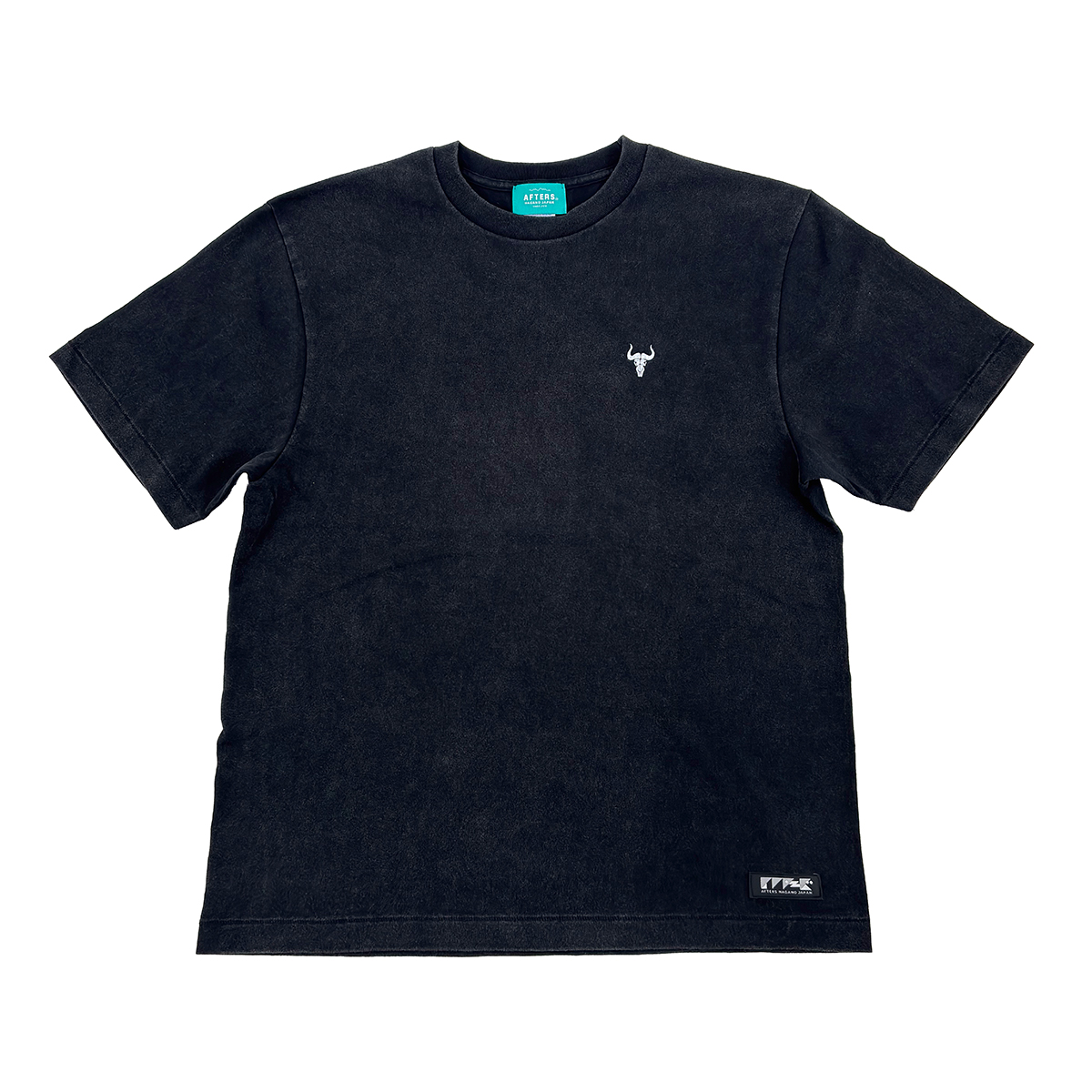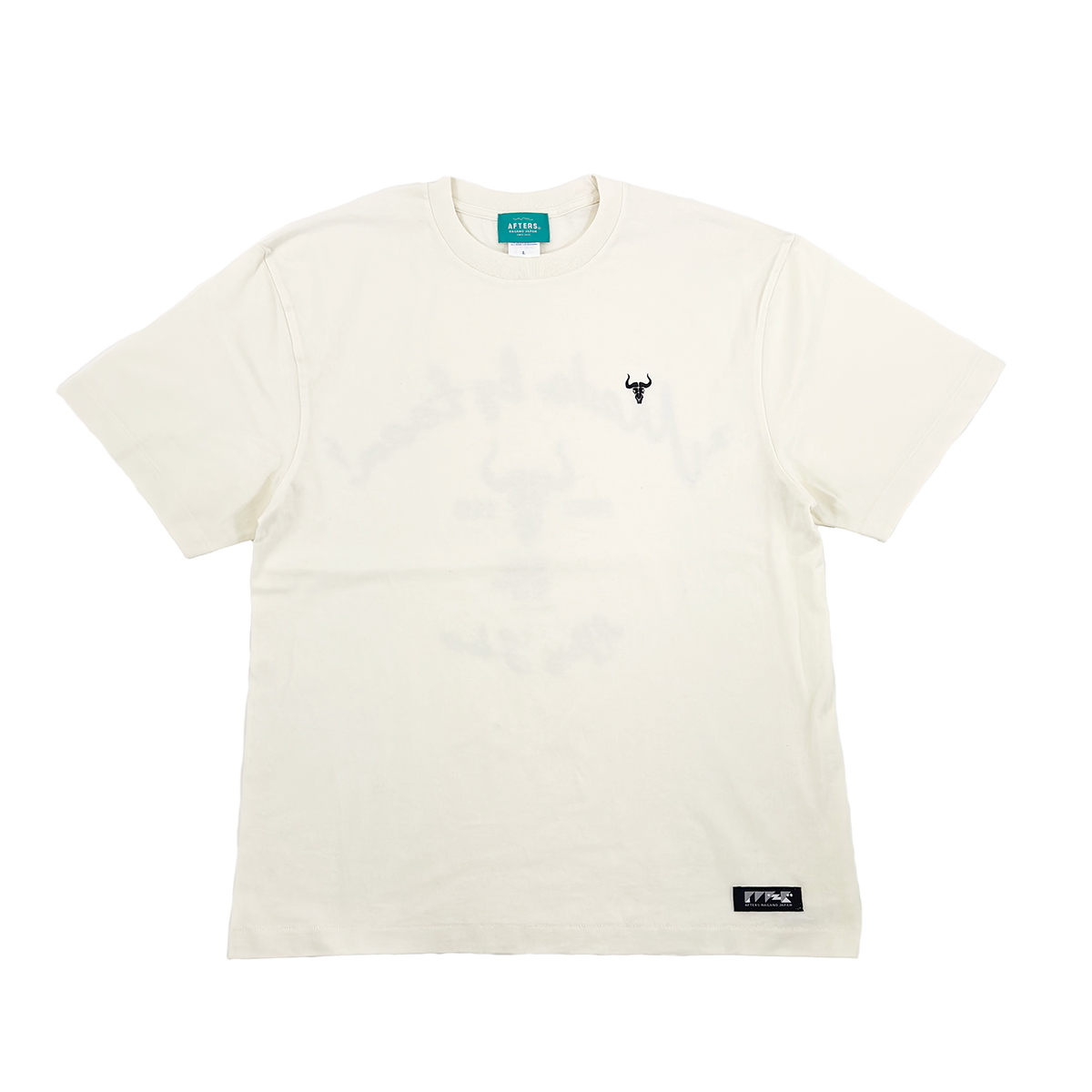 6.2オンスのオープンエンドコットンTシャツ。製品染め加工を施しあえてかすれさせたシルクスクリーンプリントをフロント、バックに。左裾にAFTERSネーム。