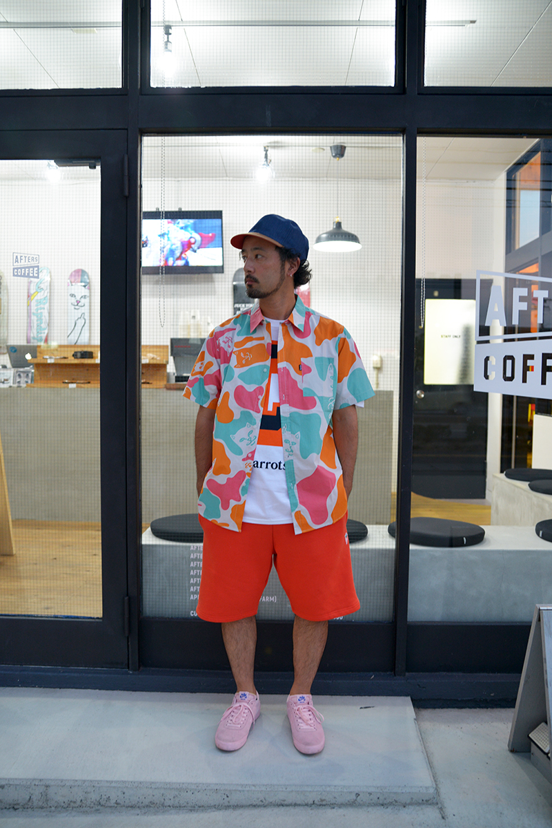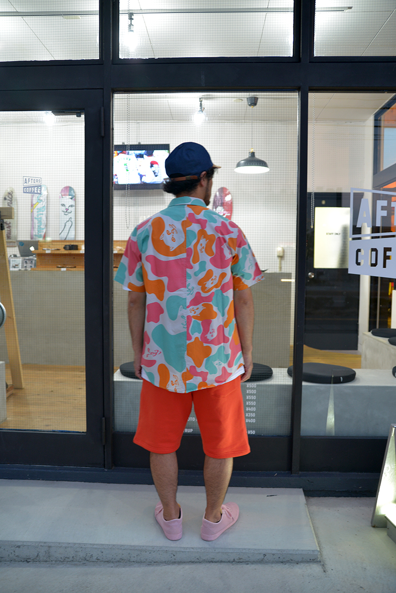 羽織ったのはRIPNDIPのカラフルなCAMOシャツ。しかしながらベースが白なのでインナーにも白で合わせるとまたスッキリでかっこいいです。そして柄の色とショーツも近いカラーで合わせると、派手なのにしっかりまとまる感じ。