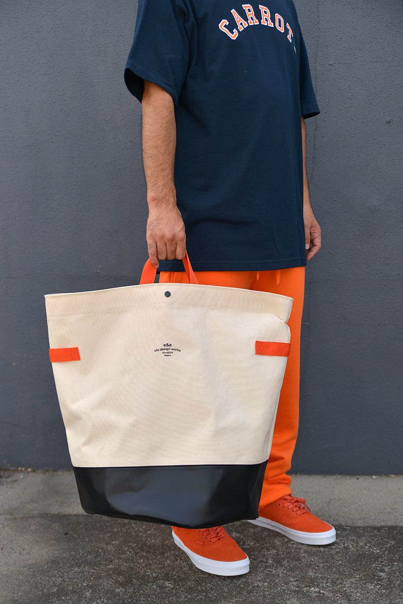 TOPSにNAVYやBLACK、WHITEなんて抜群ですよ。この組み合わせの中にトシのe&eのバッグ、テープはオレンジです。